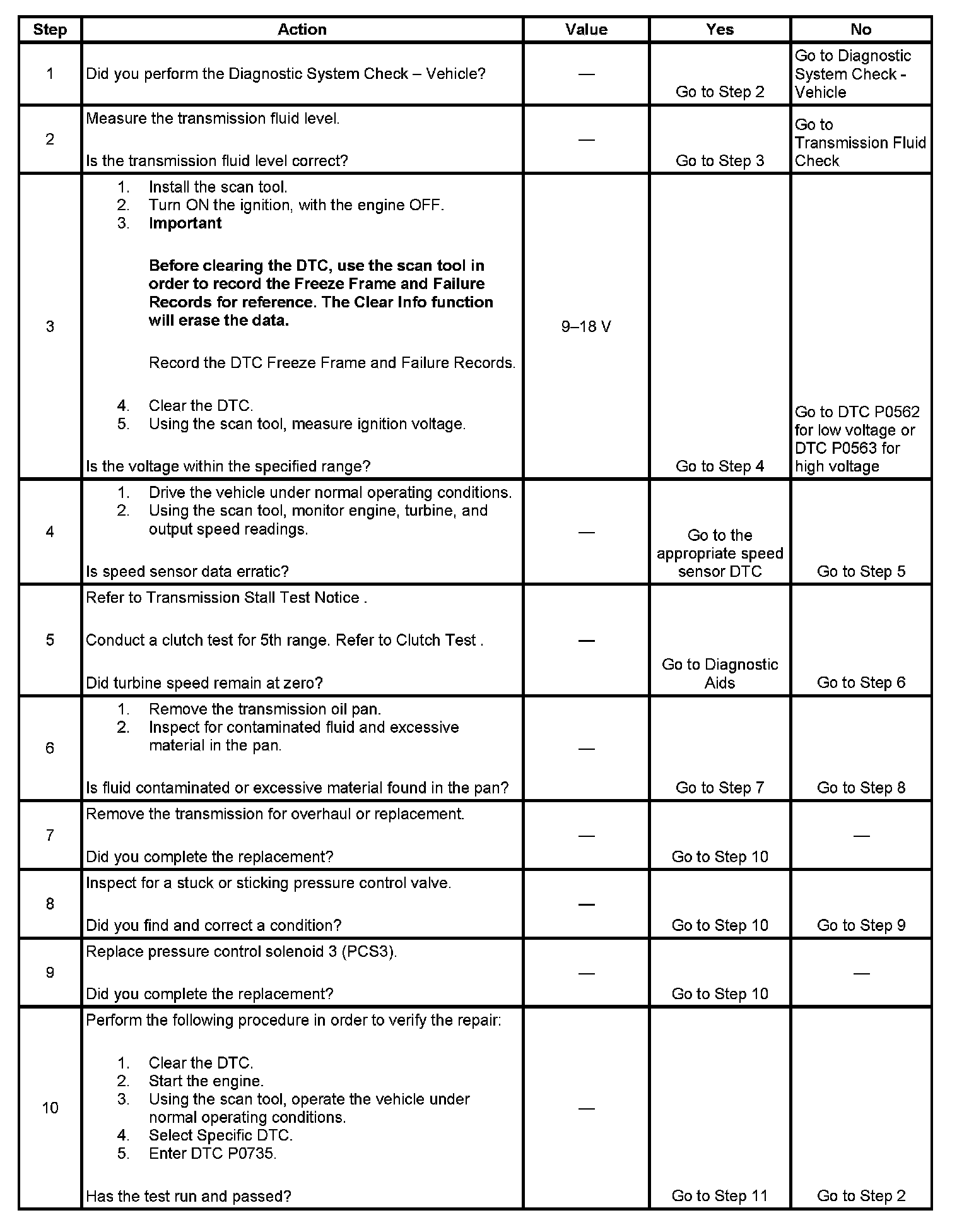 DTC P0735 sets when the calculated 5th range ratio, steady state, differs from the known 5th range ratio.
