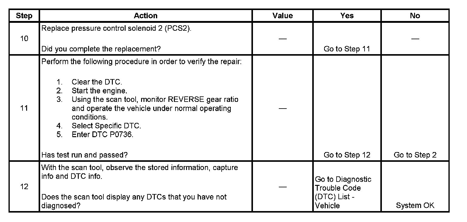 DTC P0736 sets when the calculated REVERSE range ratio, steady state, detected by the TCM differs from the known REVERSE range ratio.