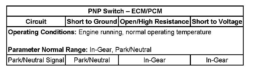 The ECM/PCM detects the Park/Neutral switch signal equals 0 volts (low) when the IMS reports a Drive range for 5 seconds and the following conditions are present: