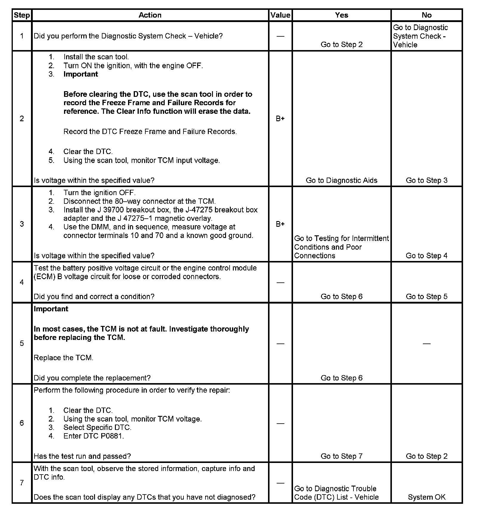 DTC P0881 sets when the TCM detects a battery direct voltage variation of 4.0 volts or greater for 30 seconds.