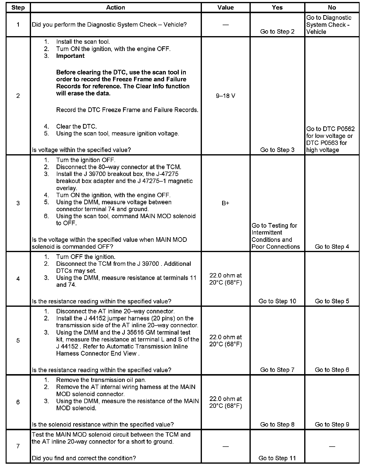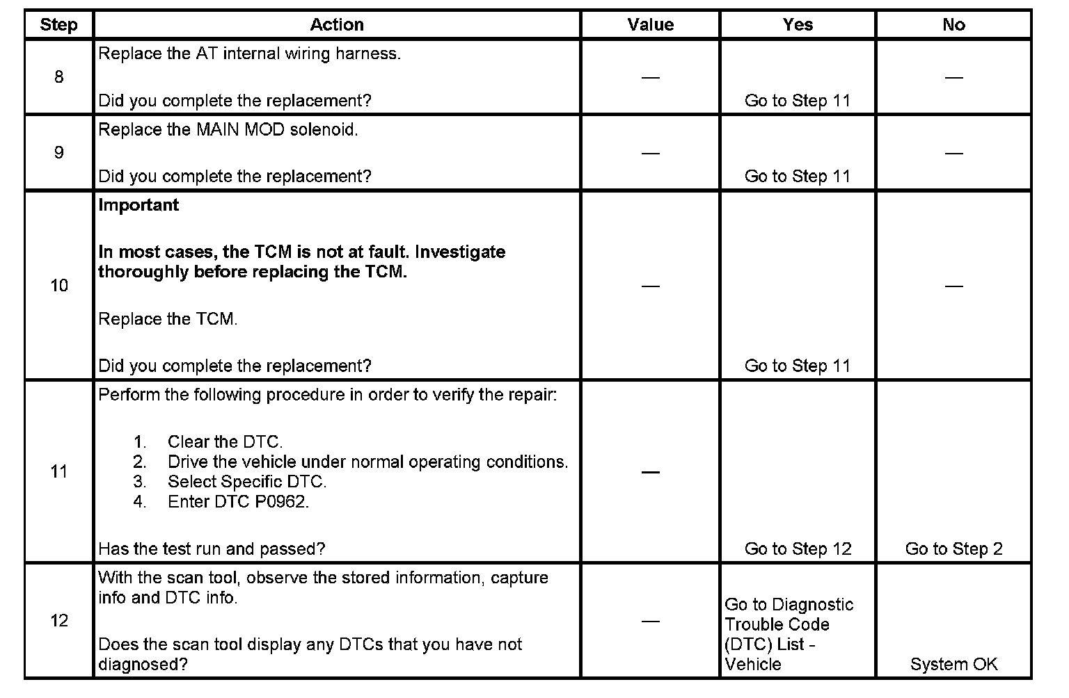 DTC P0962 sets when the TCM detects a short to ground condition in the MAIN MOD solenoid return circuit for greater than 2 seconds.