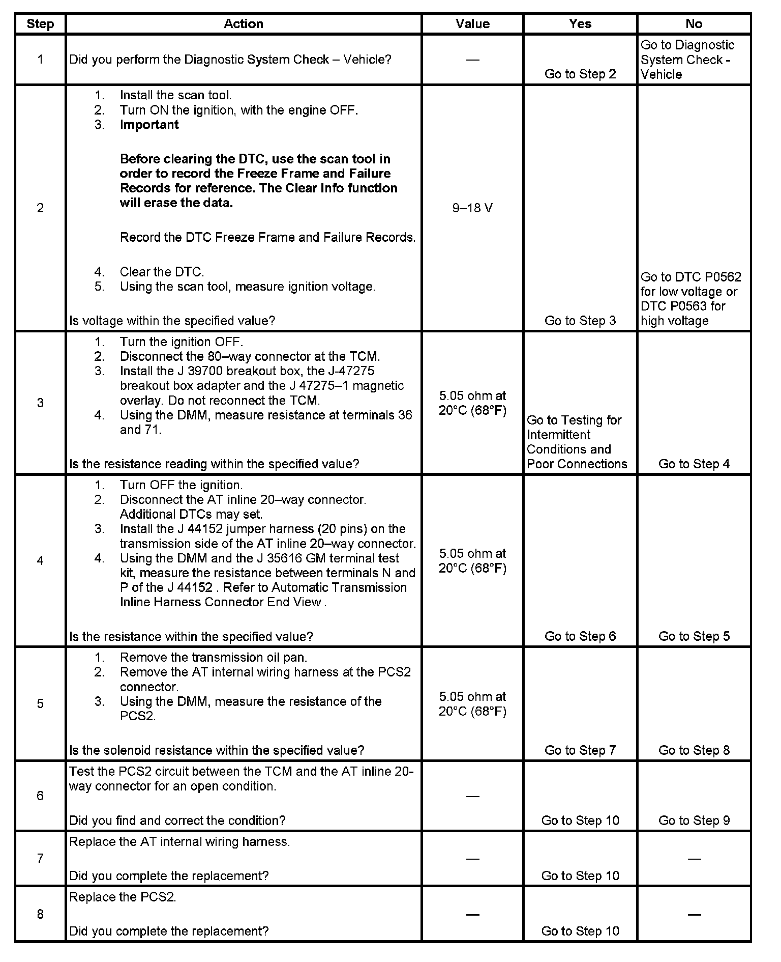 The pressure control solenoid 2 (PCS2) is a pressure proportional to current (PCC) solenoid used to control on-coming, off-going and holding pressure to any 1 of the 5 clutches. The transmission control module (TCM) provides voltage to the PCS2, shift solenoid 1, 2, and 3 (SS1, SS2, and SS3) through a separate solid-state device called high side driver 2 (HSD2). The TCM regulates the amount of current to the PCS2 by switching the low side driver ON and OFF.