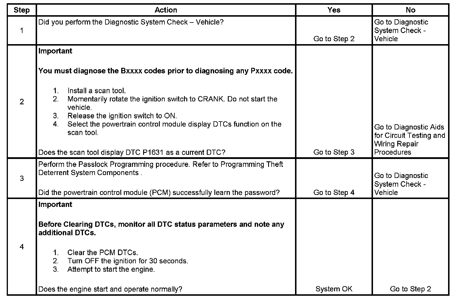 When the Passlock portion of the VTD system has sensed the proper operation of the ignition switch and lock, or determined that the switch and lock have not been tampered with, the BCM transmits a password to the PCM. Fuel delivery is enabled if this password matches the password stored in the modules memory. If a component in the theft deterrent system has been replaced, the modules need to relearn the password of the new components. If the relearn procedure was not performed, this DTC will set.