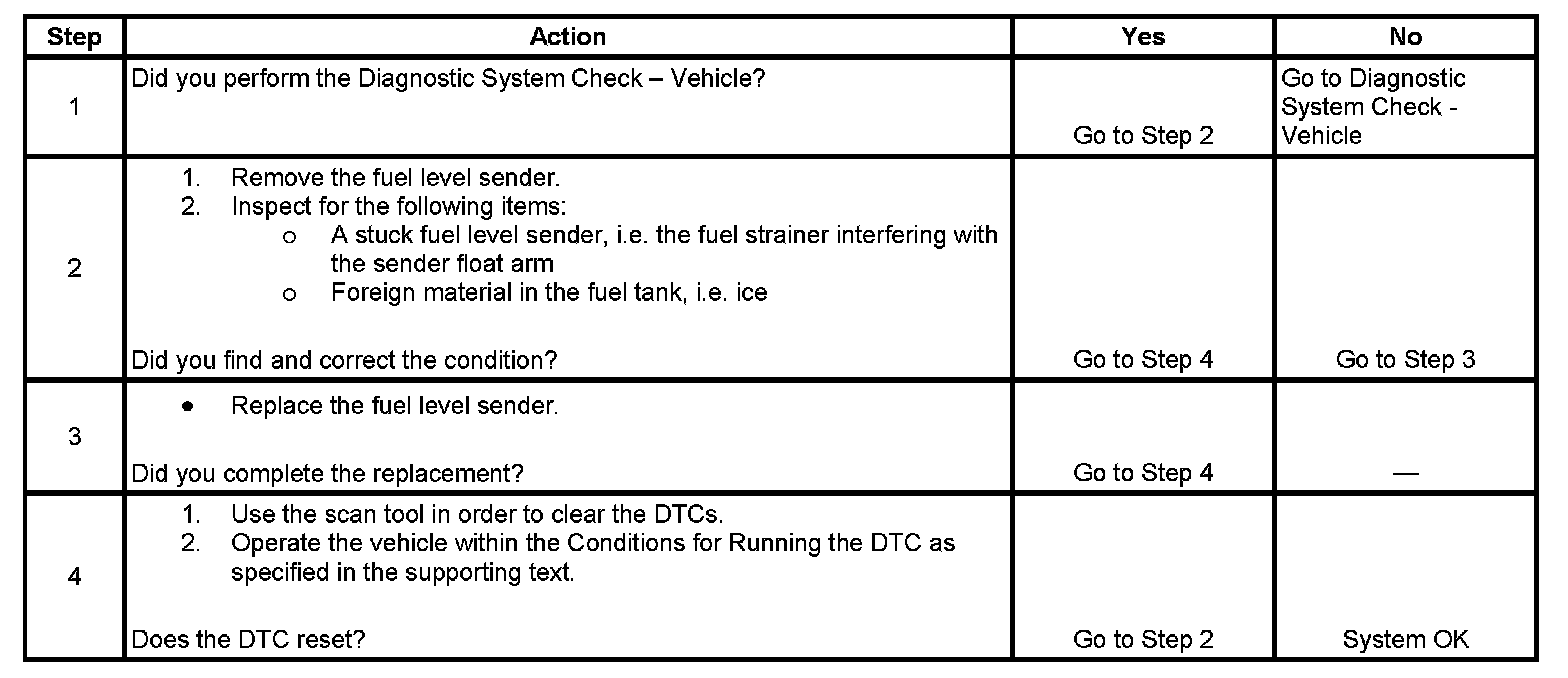The primary fuel level sender and the secondary fuel level sender changes resistance based on fuel level. The powertrain control module (PCM) monitors the signal circuits of the primary fuel level sender and the secondary fuel level sender in order to determine the fuel level. When the fuel tank is full, the resistance of both fuel level senders are low and the PCM senses a low signal voltage on both the signal circuits of the primary fuel level sender and the secondary fuel level sender. When the fuel tanks are empty, the resistance of the fuel level senders are high and the PCM senses a high signal voltage. The PCM uses the signal circuits of the primary fuel level sender and the secondary fuel level sender in order to calculate the percentage of remaining fuel in the tank. The PCM sends the fuel level percentage via the class 2 serial data circuit to the instrument cluster in order to control the fuel gage. The fuel level information is also used for misfire and evaporative emissions (EVAP) diagnostics.
