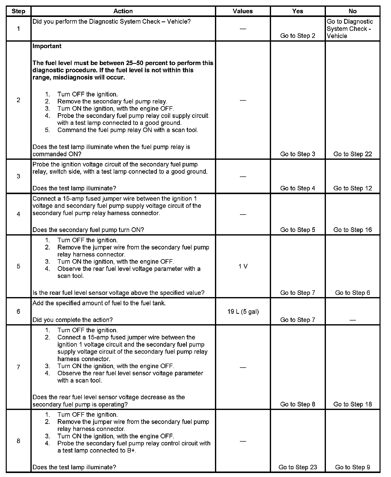 7. This step tests the secondary fuel pumps ability to transfer fuel. The rear fuel level sensor voltage should decrease while the secondary fuel pump is ON.