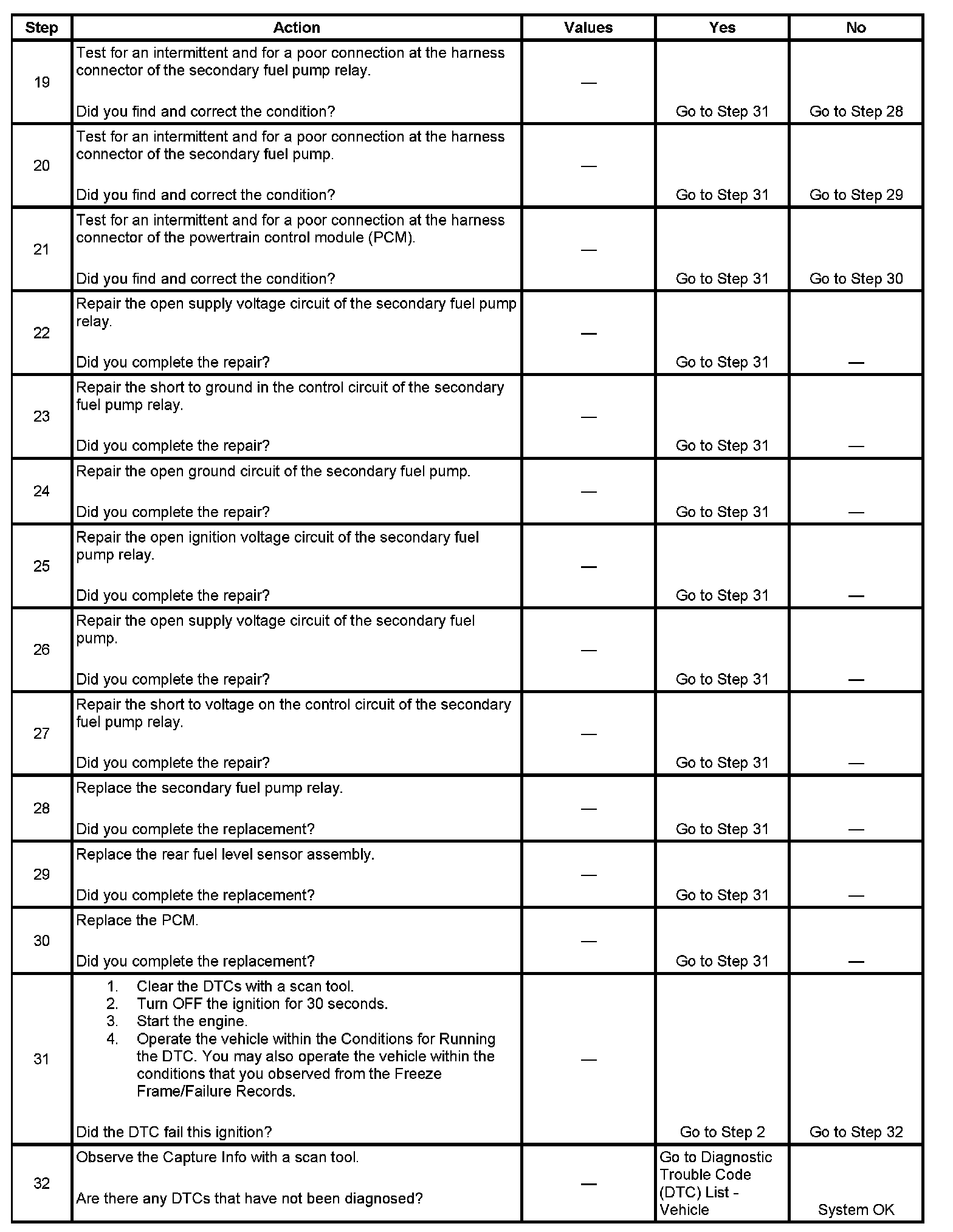 The secondary fuel pump is located in the rear fuel tank. The secondary fuel pump is powered by a secondary fuel pump relay. Fuel is transferred from the rear fuel tank to the front fuel tank in order to ensure all of the usable fuel volume is available to the primary fuel pump. The secondary fuel pump relay supply voltage is received from the primary fuel pump relay when the primary fuel pump is energized. This DTC sets when the powertrain control module (PCM) commands the secondary fuel pump ON and a predetermined change in both the front and rear fuel level sensors does not occur.