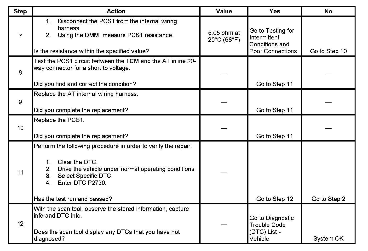 DTC P2730 sets when the TCM detects a short to voltage on the PCS1 circuit for greater than 2 seconds.