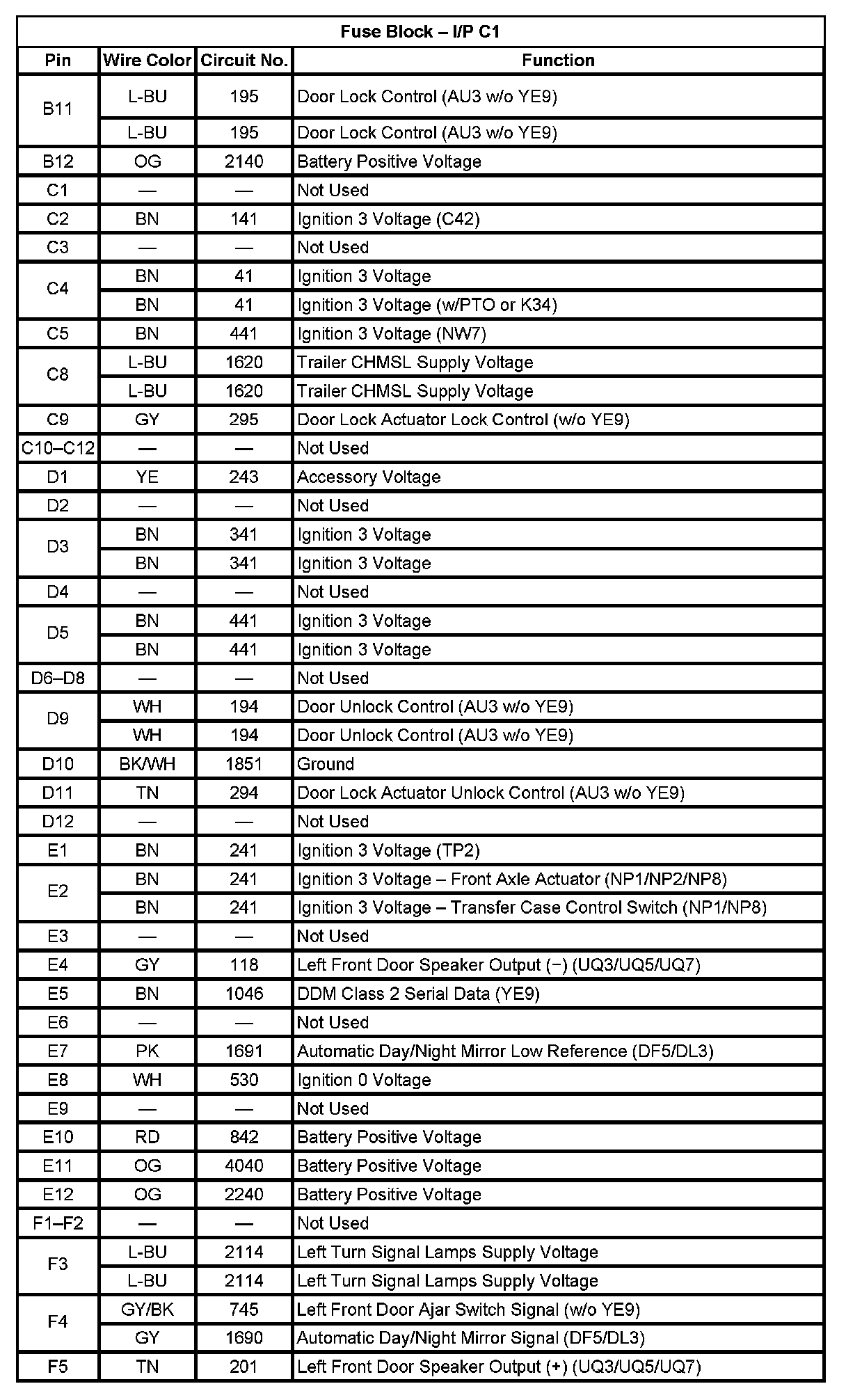 Fuse Block - I/P C1 (Pin B11 To F5):