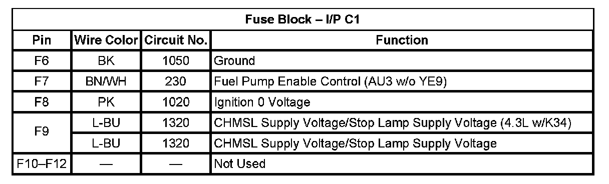 Fuse Block - I/P C1 (Pin F6 To F12):