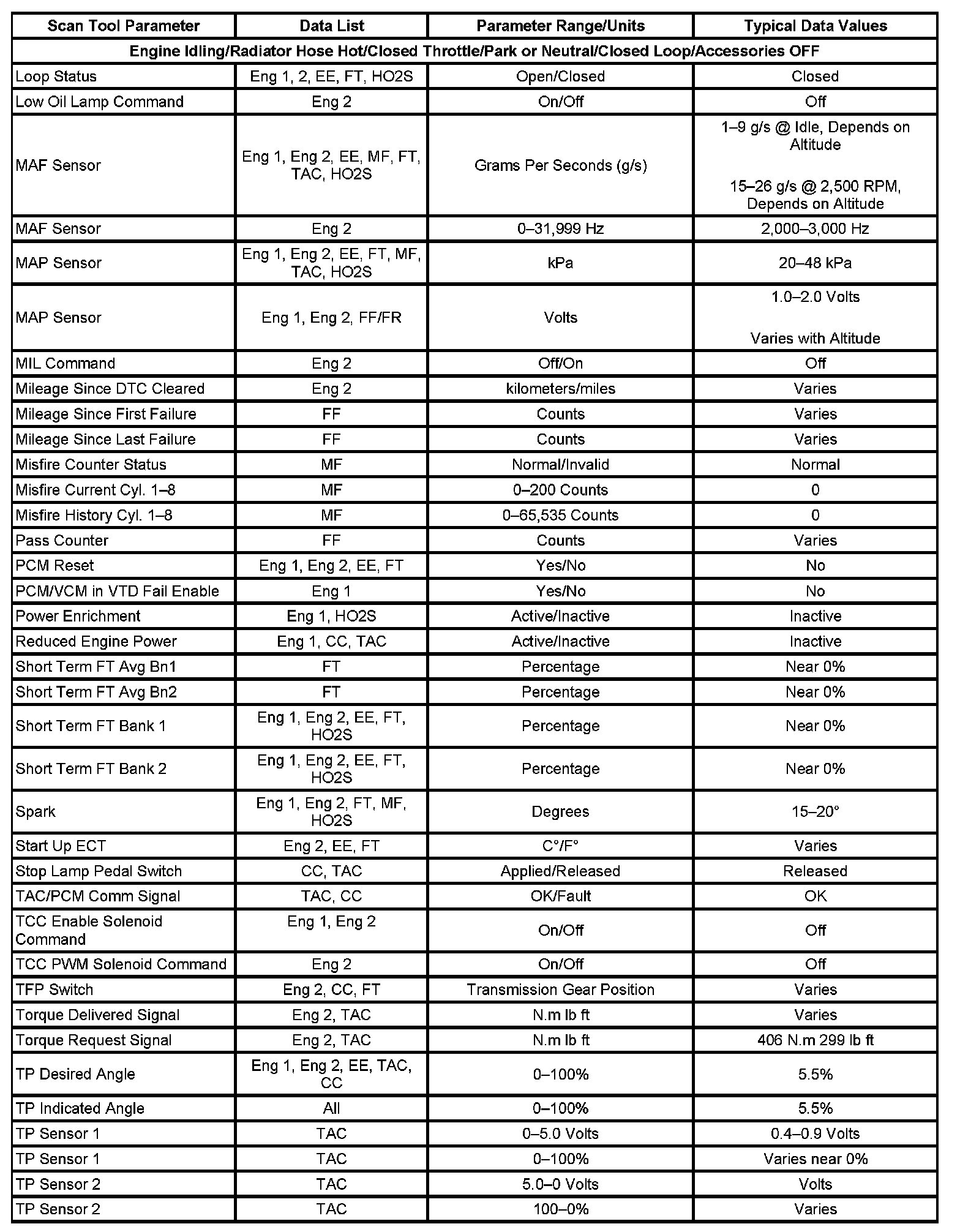 The Engine Scan Tool Data List contains all engine related parameters that are available on the scan tool. The list is arranged in alphabetical order. A given parameter may appear in any one of the data lists, and in some cases may appear more than once, or in more than one data list in order to group certain related parameters together.