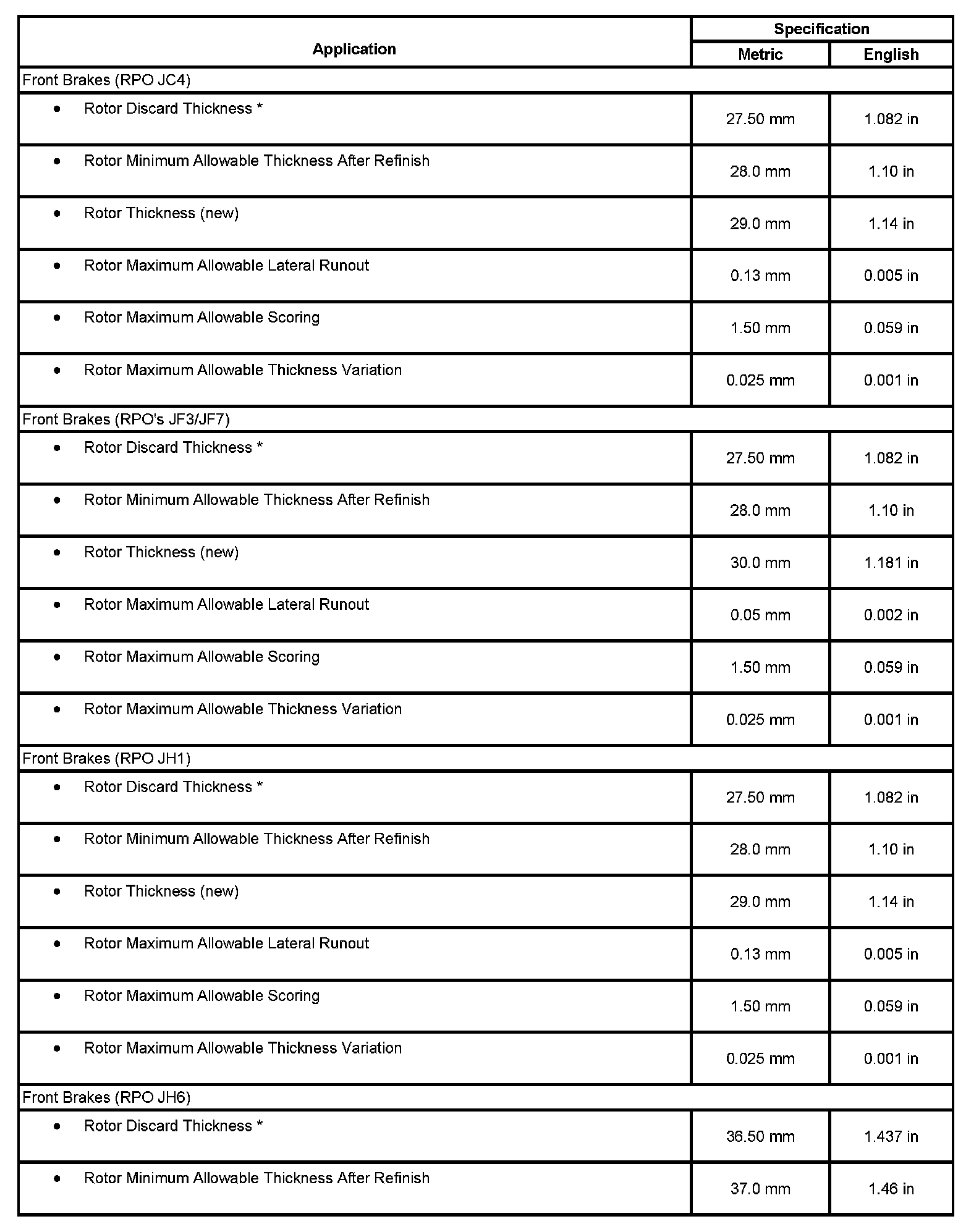 Disc Brake Component Specifications (Part 1):