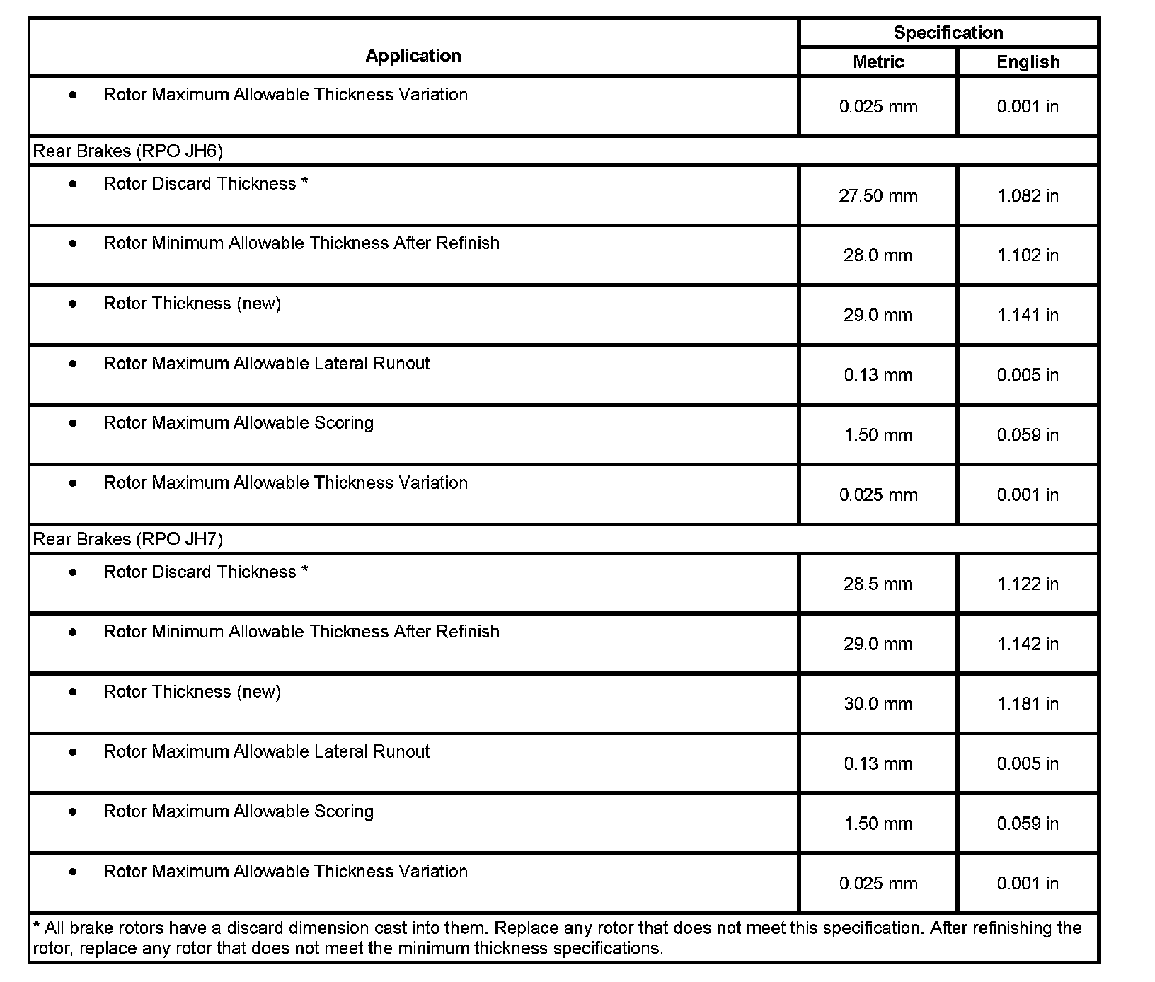 Disc Brake Component Specifications
