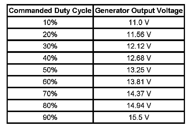 The generator battery control module monitors the generator performance though the generator field duty cycle signal circuit, the generator field control circuit, and the battery positive voltage circuit. The generator battery control module controls the generator through the generator field control, charge indicator control, circuit. The signal is a 5-volt pulse width modulation (PWM) signal of 128 Hz +/- 5 percent with a duty cycle of 0-100 percent. The duty cycle sent by the generator battery control module is limited between 36-90 percent. When the engine is turned OFF, the module will send 0 percent duty cycle, low voltage. When there is loss of class 2 communication with the powertrain control module (PCM), the module will send 100 percent duty cycle, 13.8 volts. The table shows the commanded duty cycle and output voltage of the generator:
