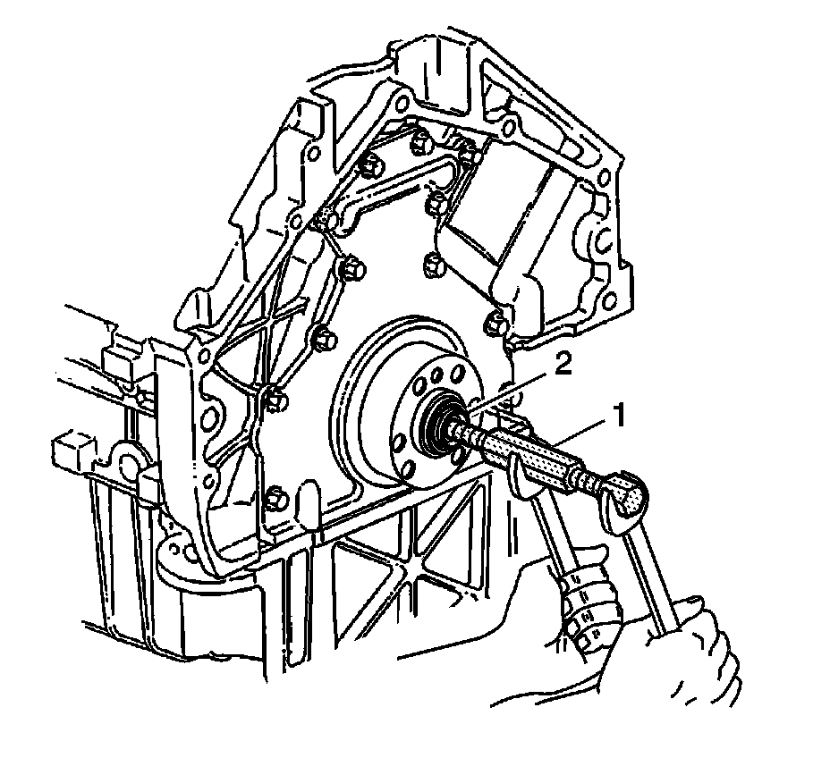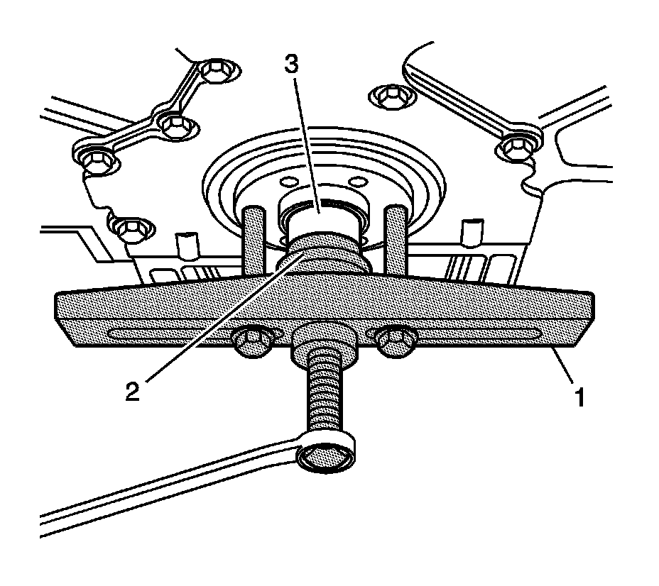 2. Using J 8433-1 (1) and J 45949 (2) install the locator bushing (3) into the rear of the crankshaft.