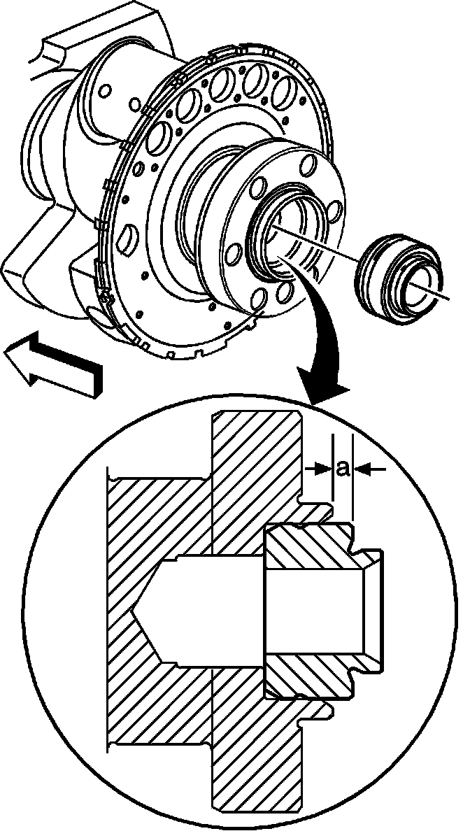 3. Inspect the locator bushing for proper installation. A properly installed bushing should protrude no more than 8.4 mm (0.33 inch) (a) from the rear of the crankshaft.