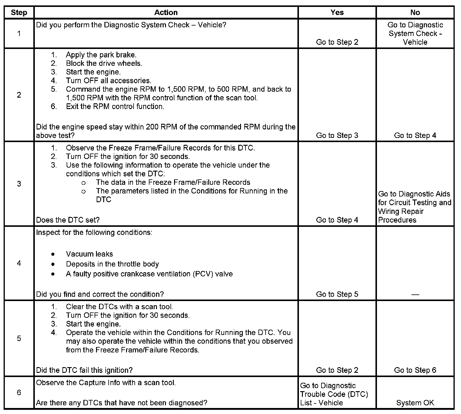 The electronic throttle control (ETC) system uses various inputs from the powertrain control module (PCM). This system uses these inputs to control the idle speed through serial data circuits to the throttle actuator control (TAC) module. The DC motor, which is located on the throttle body, activates the throttle plate. In order to decrease idle speed, the TAC module commands the throttle closed, reducing air flow into the engine, and the idle speed decreases. In order to increase the idle speed, the TAC module commands the throttle plate open, allowing more air in order to bypass the throttle plate. If the actual idle RPM does not match the desired idle RPM within a calibrated time, DTC P0507 sets.