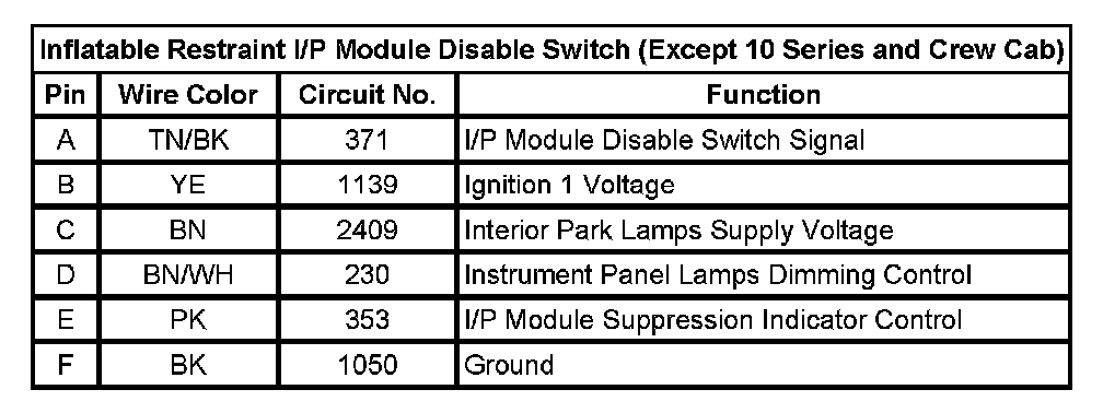 Inflatable Restraint I/P Module Disable Switch (Except 10 Series and Crew Cab)