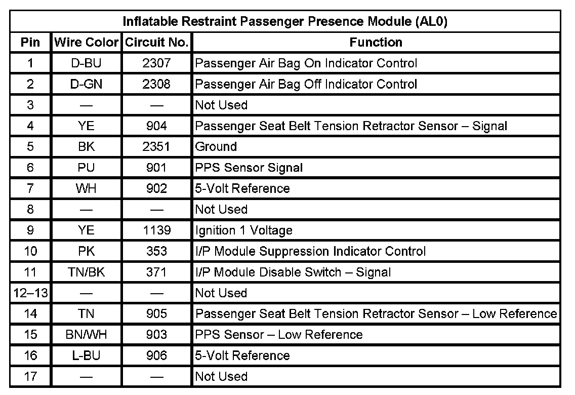 Inflatable Restraint Passenger Presence Module (With RPO Code AL0) (Pin 1 To 17):