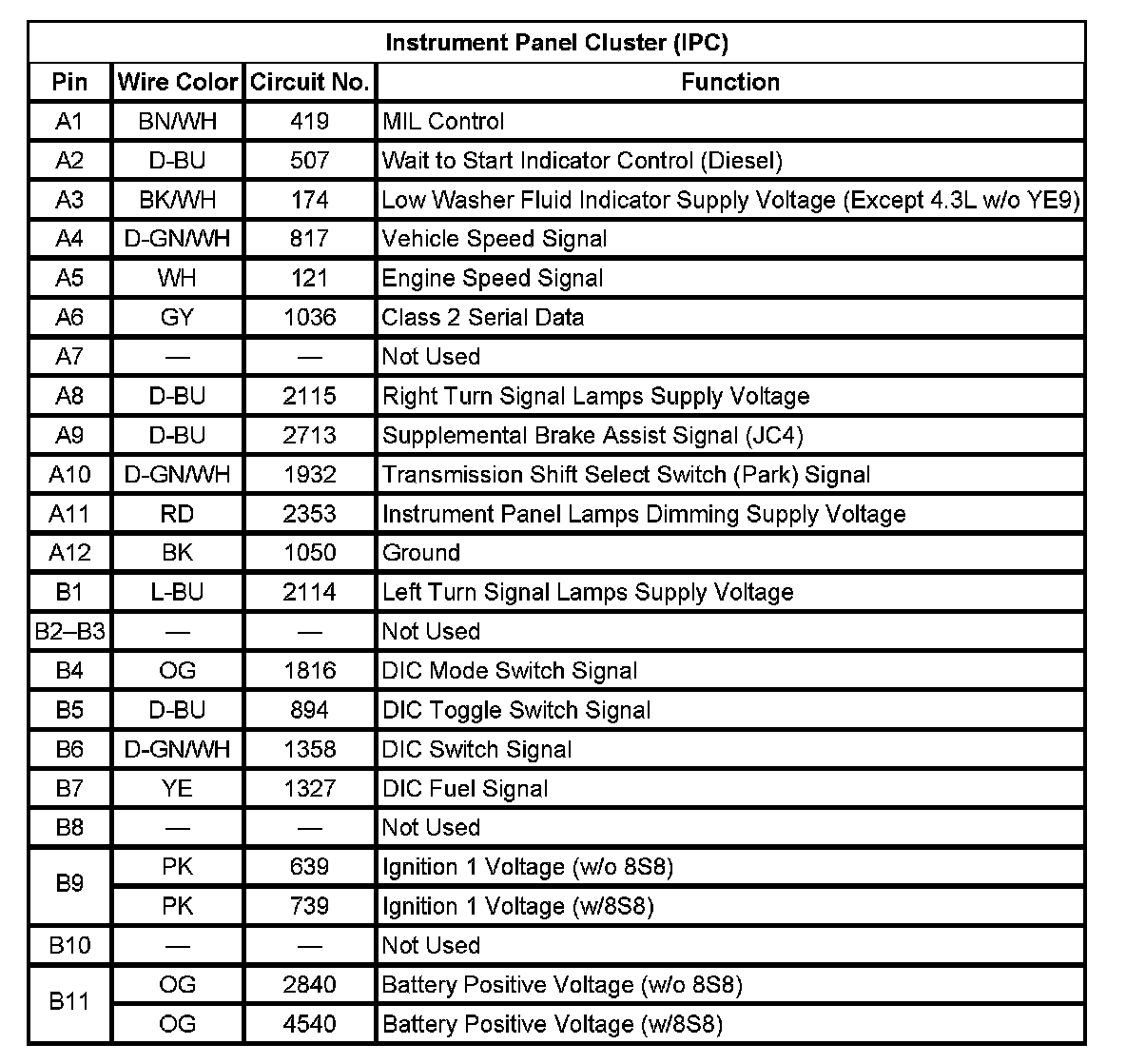 Instrument Panel Cluster (IPC) (Pin A1 To B11):