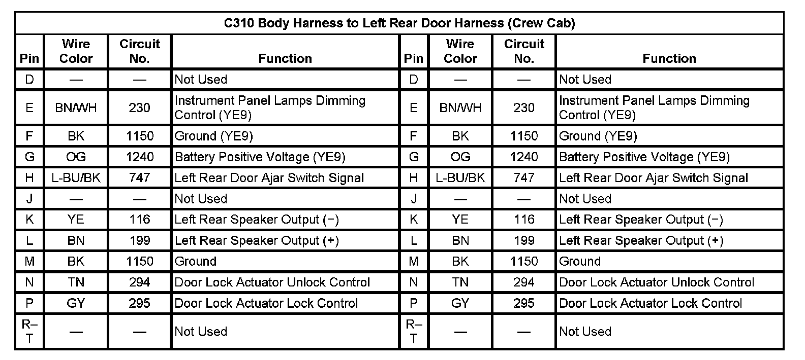 C310 Body Harness To Left Rear Door Harness (Crew Cab) (Pin D To T):