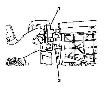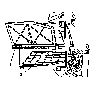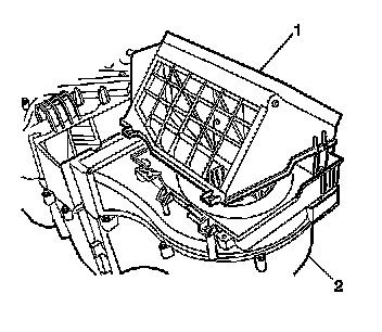 4. Remove the upper recirculation housing (1) from the HVAC module assembly (2).