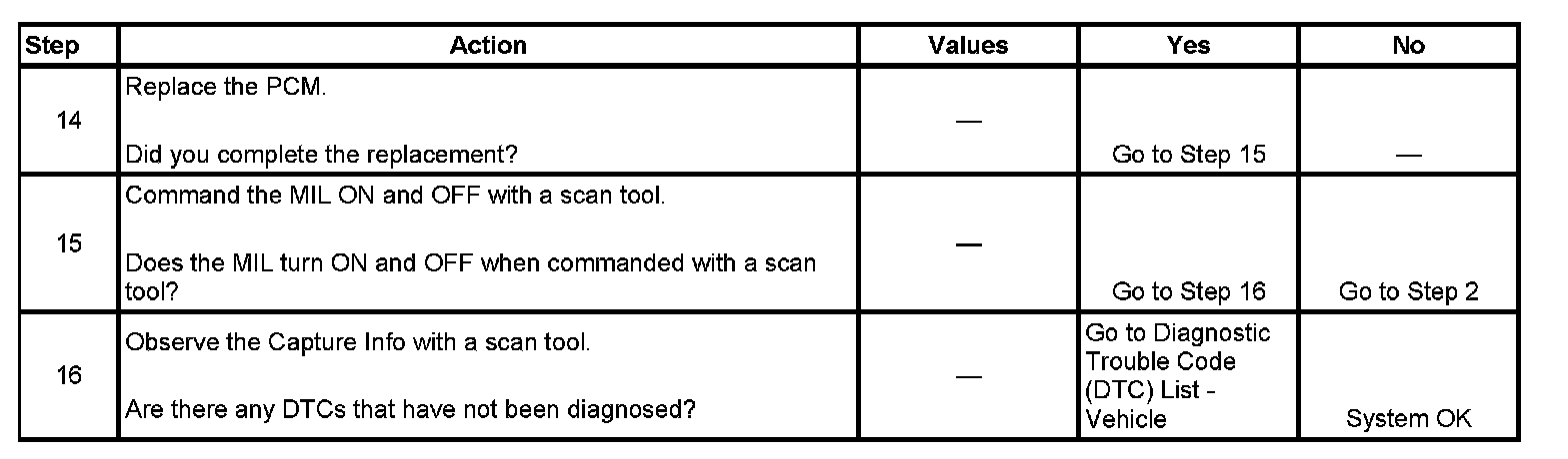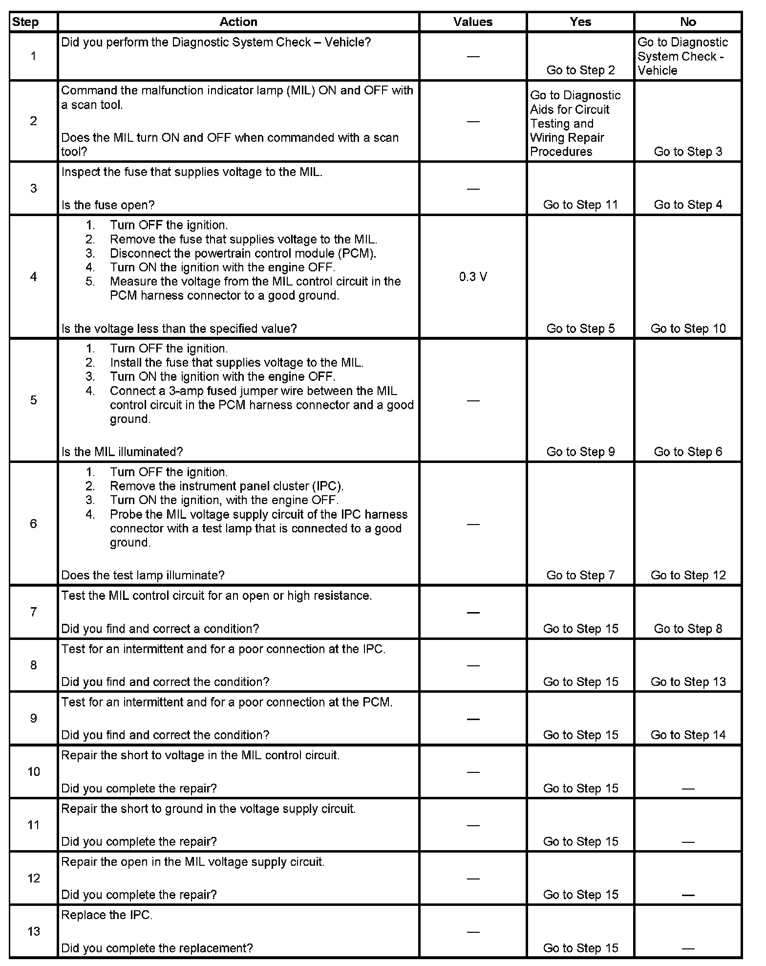 Voltage is supplied directly to the malfunction indicator lamp (MIL). The powertrain control module (PCM) turns the MIL ON by grounding the MIL control circuit. There should be a steady MIL with the ignition ON and the engine OFF.