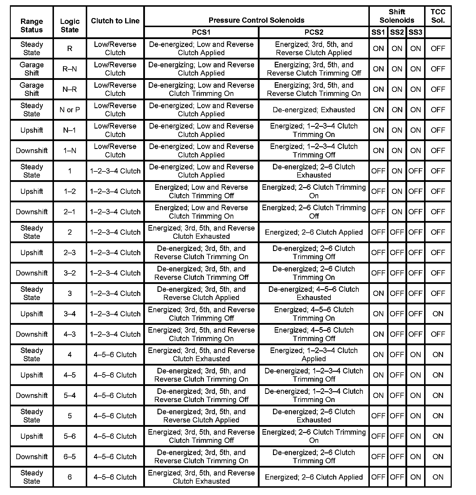 Solenoid and Clutch Chart (Normal Mode)