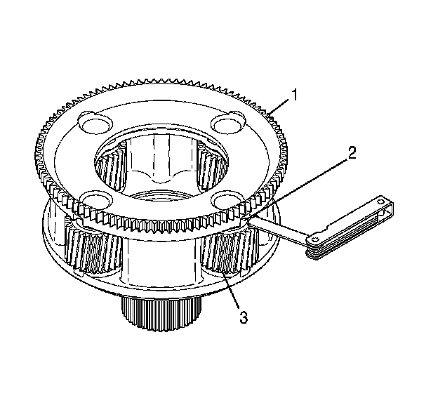 1. Check the end play between the intermediate carrier assembly (1) and the thrust washer (2) at each pinion gear (3).