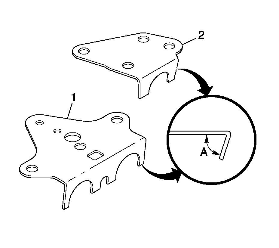 1. Measure the angle between the surfaces of the PCS1/PCS2 retaining bracket (1), and the TCC PCS retaining bracket (2), as shown in insert, angle A.