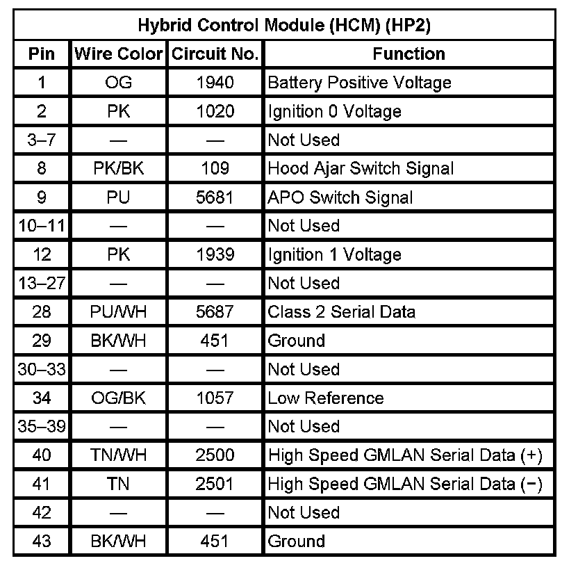 Hybrid Control Module (HCM) - (With RPO Code HP2) (Pin 1 To 43):