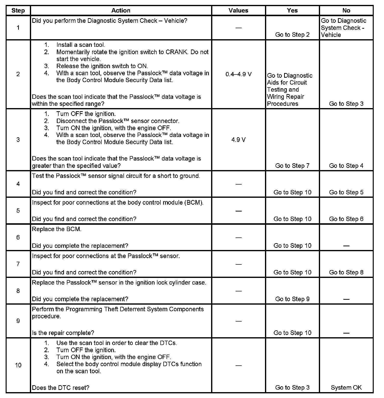 * Use a scan tool in order to inspect the Passlock(TM) data voltage and the Passlock(TM) code.
