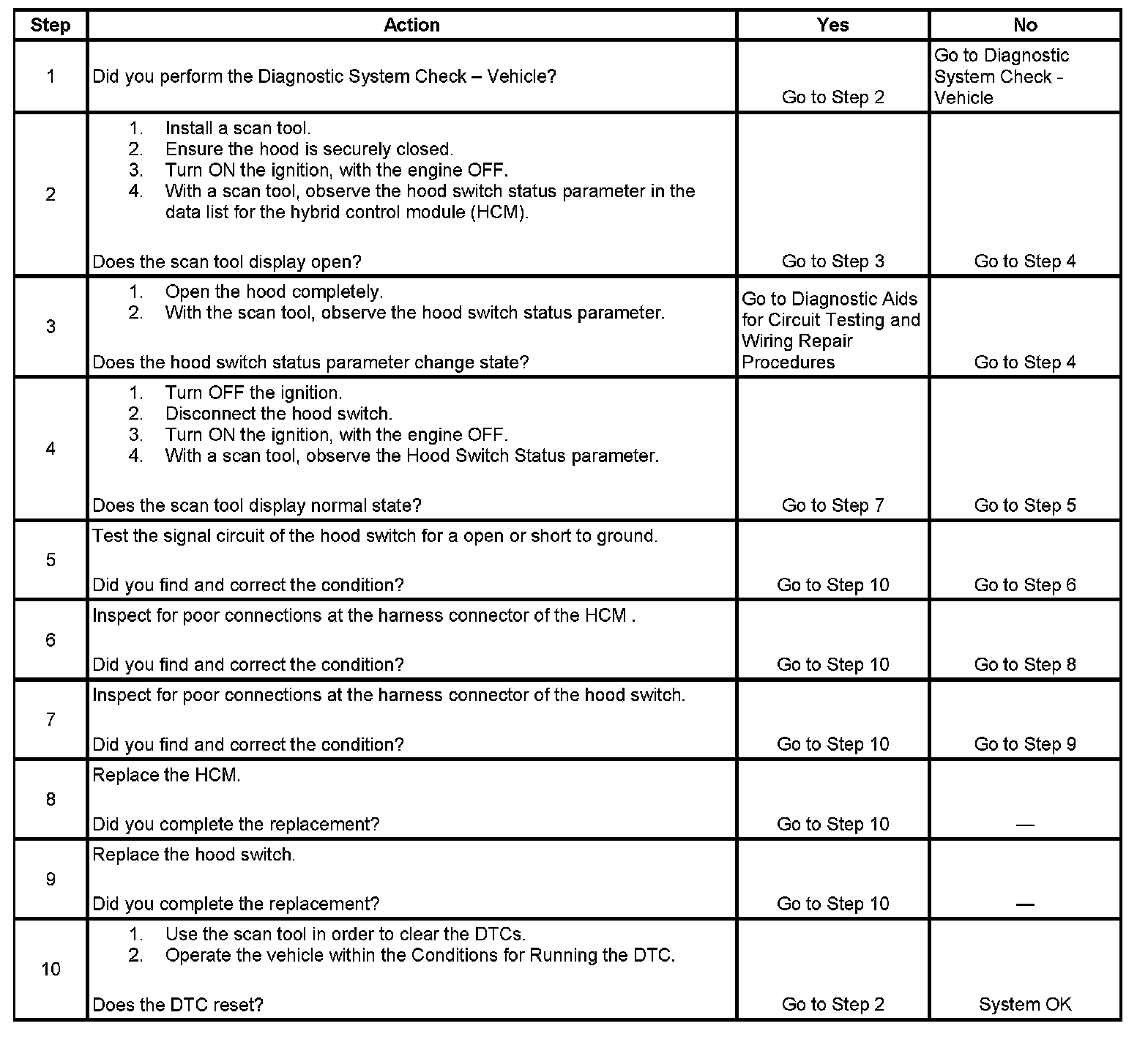 The hybrid control module (HCM) uses the hood switch signal to monitor the open or closed position of the hood for hybrid system function. The hood switch indicates the state of the vehicle hood, either open or closed. The hood switch output signal is an input to an HCM. Five volts is supplied to the switch, the returned voltage is measured relative to HCM signal ground to determine the switch state. A resistor network in the switch circuitry ensures that shorted high and low states can be diagnosed successfully. There are 2 valid voltage ranges of the return signal, one representing hood open, the other representing hood closed. If the voltage is lower than a threshold, a short low is indicated. Similarly, if the voltage is greater than the short high threshold, a short high is indicated. If the voltage is not high, low, open, or closed, then the state invalid is indicated. Driver Notification - Hood Ajar is used to request the instrument panel cluster (IPC) to display or clear the Hood Ajar message on the driver information center (DIC). This message will be displayed by the IPC until the driver acknowledges the message e.g., via the IPC Stem, Trip, Fuel, Personalization or Select buttons on the Steering Wheel or until requested off by the HCM via GMLAN message. The HCM shall not request the message to be displayed again until the next ignition cycle if the conditions for setting the message still exist unless or until the hood transitions back to closed and then back to reopened.