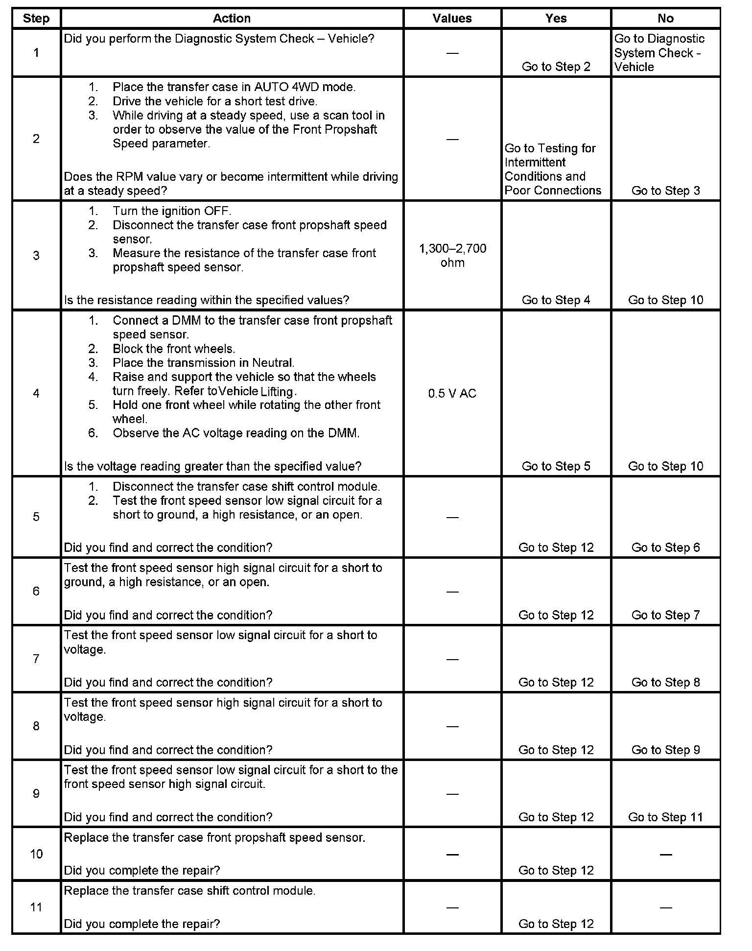 The module accesses this input when the vehicle is in AUTO 4WD mode, 4HI, and 4LO ranges. The propshaft RPM can be displayed with a scan tool.