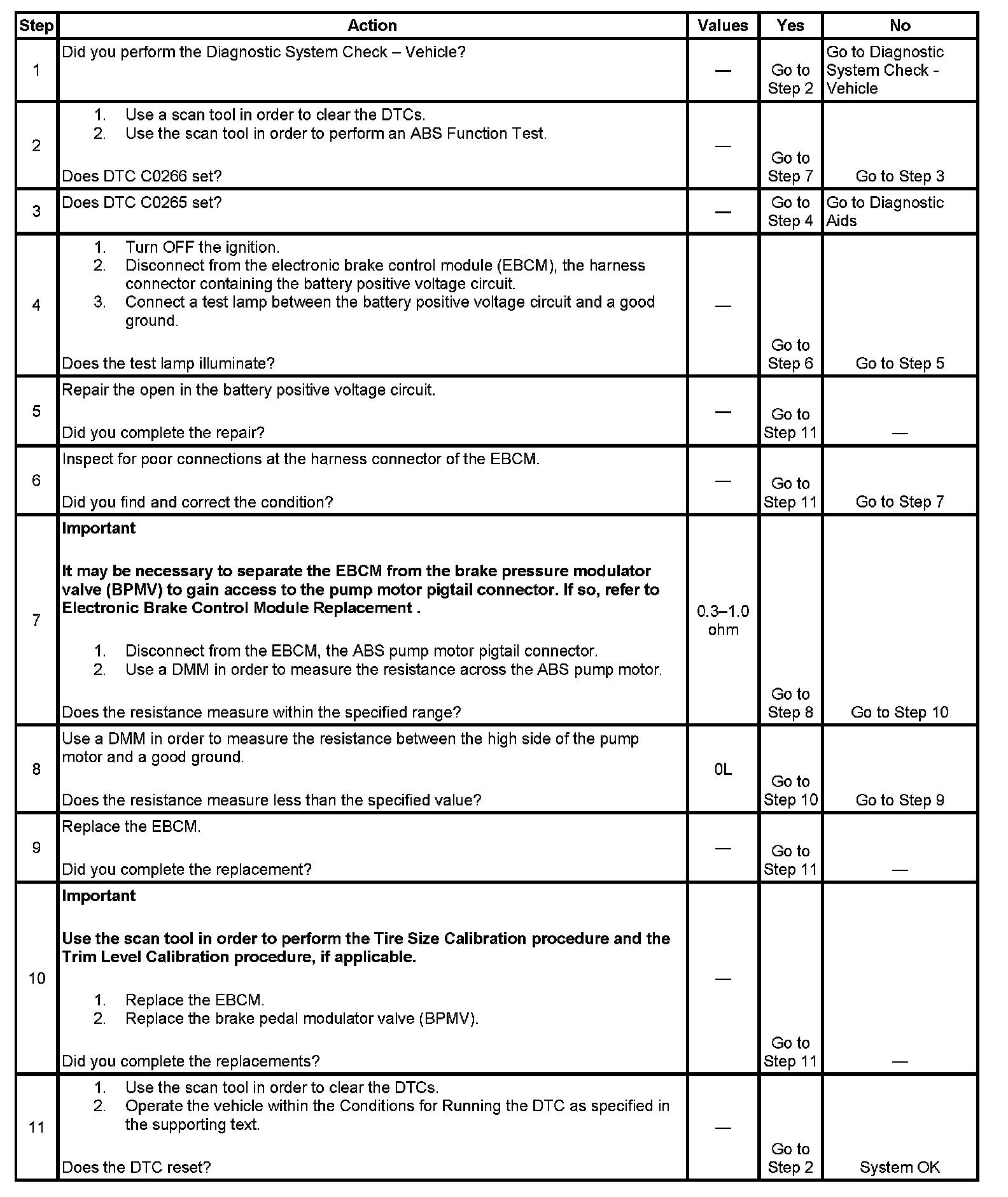 Important: Whenever the EBCM is replaced for DTC C0265 or C0266, the ABS pump motor and motor circuitry must be tested for the proper resistance. Refer to steps 7 and 8 in the diagnostic table below for testing procedures and resistance values.