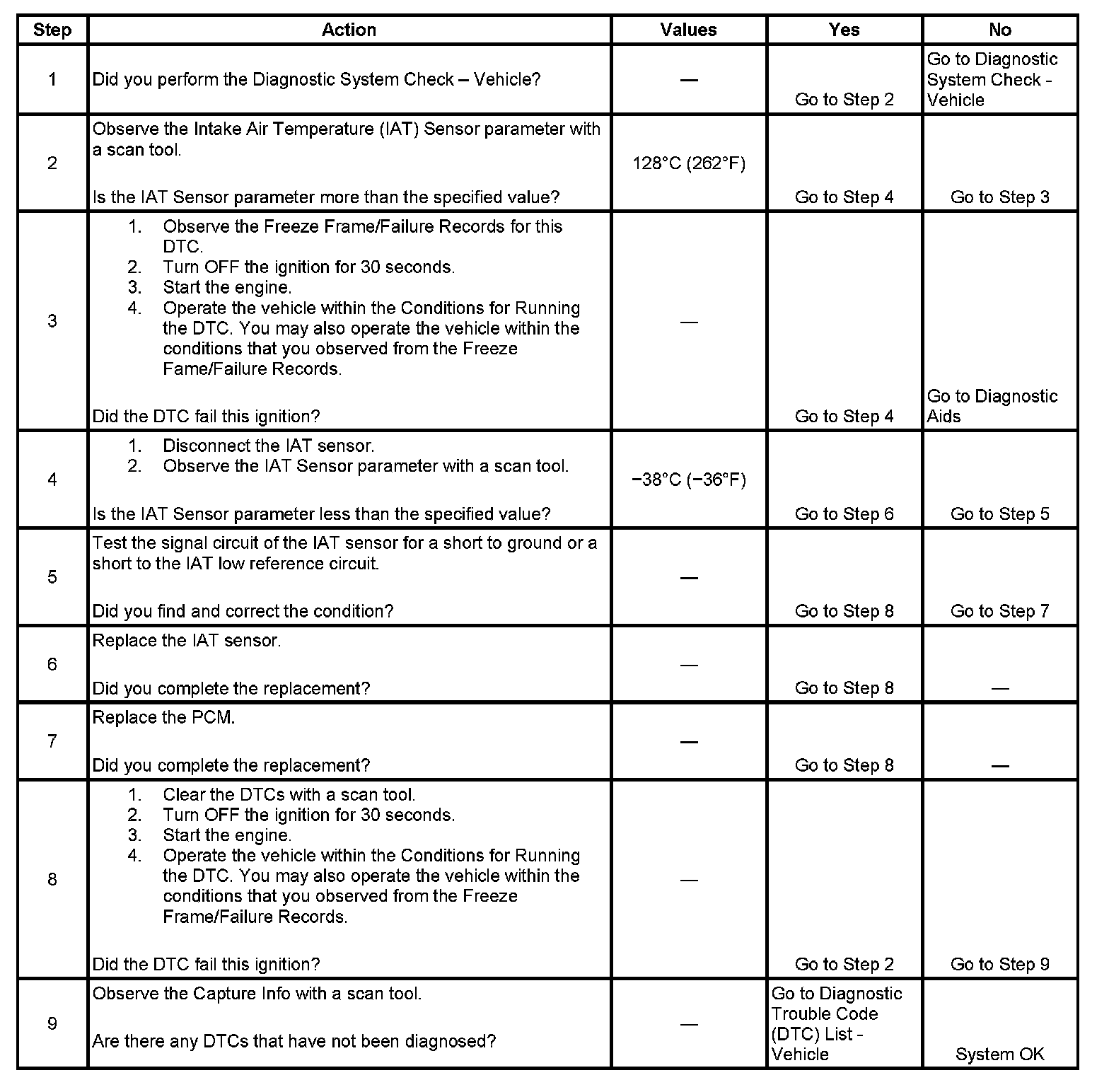 The intake air temperature (IAT) sensor is a variable resistor. The IAT sensor has a signal circuit and a low reference circuit. The IAT sensor measures the temperature of the air entering the engine. The powertrain control module (PCM) supplies 5 volts to the IAT signal circuit and a ground for the IAT low reference circuit. When the IAT sensor is cold, the sensor resistance is high. When the air temperature increases, the sensor resistance decreases. With high sensor resistance, the PCM detects a high voltage on the IAT signal circuit. With lower sensor resistance, the PCM detects a lower voltage on the IAT signal circuit. If the PCM detects an excessively low IAT signal voltage, indicating a high temperature, DTC P0112 sets.