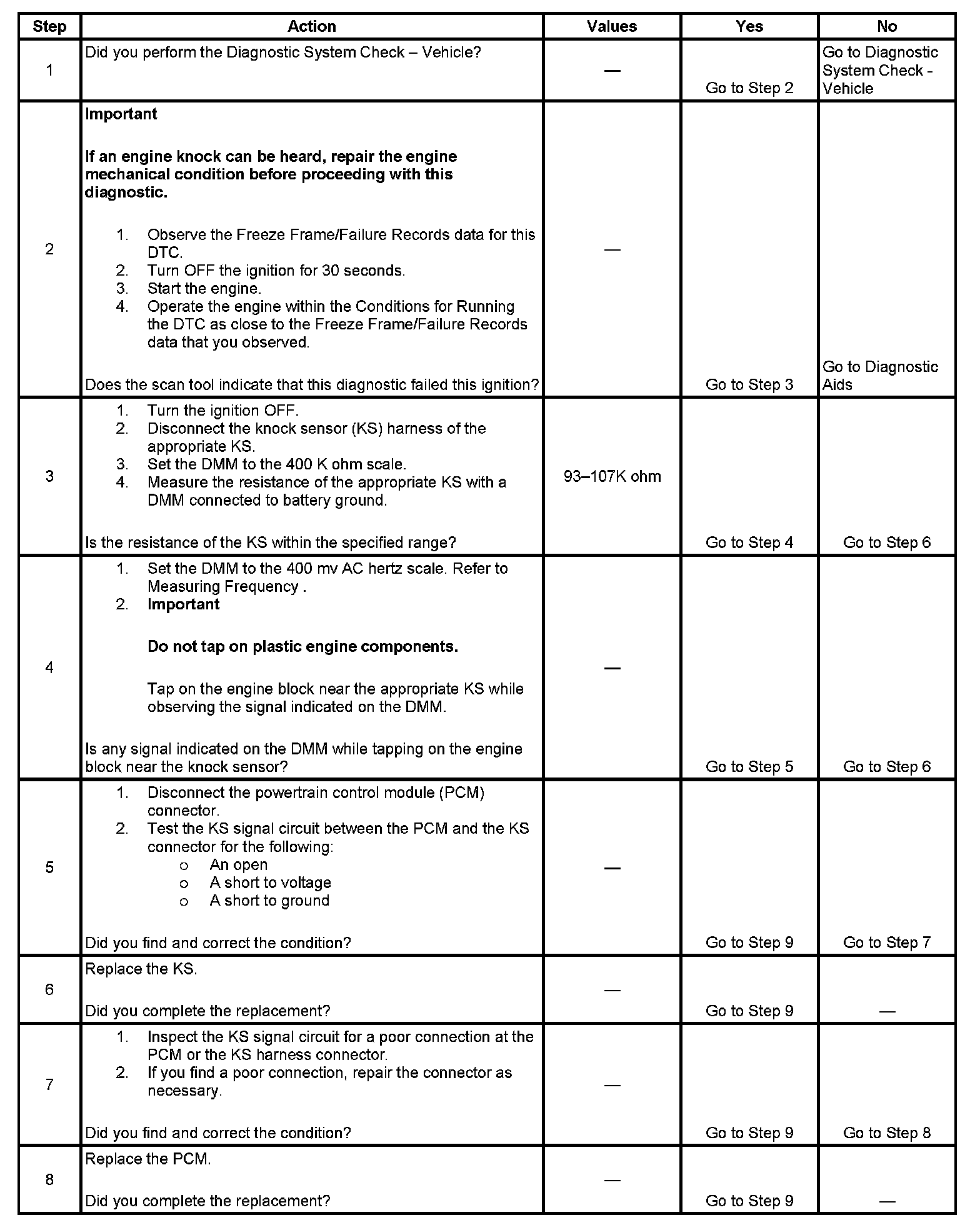 The knock sensors (KS) produce an AC signal when specific frequencies are detected. When the engine operates, the powertrain control module (PCM) learns a minimum and maximum frequency of noise of normal engine operation. The KS System monitors both knock sensors in order to determine if knock is present. If the KS System determines that excessive knock is present, the PCM retards the spark timing based on the signals from the KS system. The PCM then retards the timing until no knock is present. When the PCM detects a frequency that is less than or more than a defined range, DTC P0327 will set for a failure in KS 1 which is located on bank 1 on the drivers side of the engine or DTC P0332 will set for a failure in KS 2 which is located on bank 2 on the passenger side of the engine.