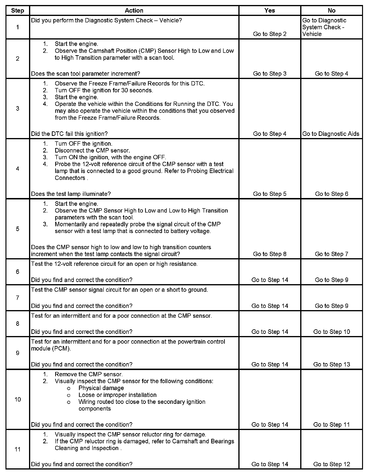The CMP sensor 1 X signal is used by the PCM to determine if the cylinder at top dead center (TDC) is on the firing stroke or the exhaust stroke. The PCM can determine TDC for all cylinders by using the crankshaft position (CKP) sensor 24 X signal alone. The engine will start without a CMP signal as long as the PCM receives the CKP sensor 24 X signal. A slightly longer cranking time may be a symptom of this condition. The system attempts synchronization and looks for an increase in engine speed indicating that the engine started. If the PCM does not detect an increase in engine speed, the PCM assumes that the PCM incorrectly synchronized to the exhaust stroke and re-syncs to the opposite cam position. If the PCM detects that a CMP signal is constantly low, DTC P0342 sets.