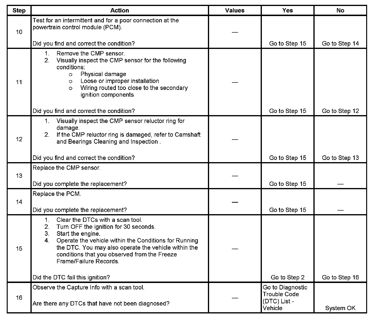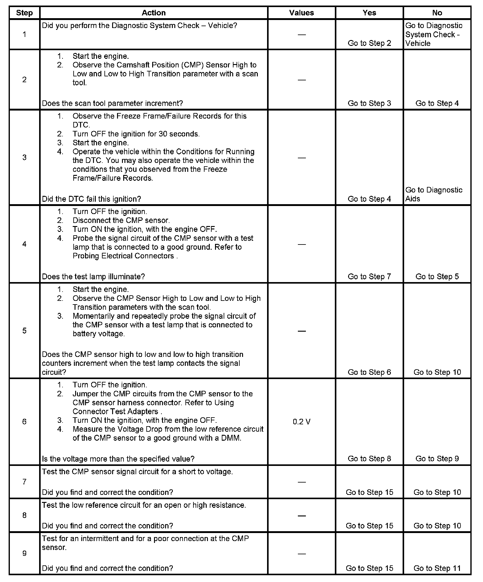 5. This step tests the CMP sensor signal circuit. Applying a voltage causes the CMP Sensor High to Low and Low to High parameter to increase if the circuit and the PCM are operating properly.
