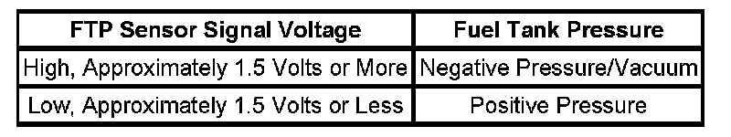 The table illustrates the relationship between the FTP sensor signal voltage and the EVAP system pressure/vacuum.
