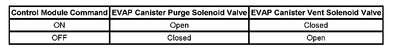 The table illustrates the relationship between the ON and OFF states, and the Open or Closed states of the EVAP canister purge and vent solenoid valves.