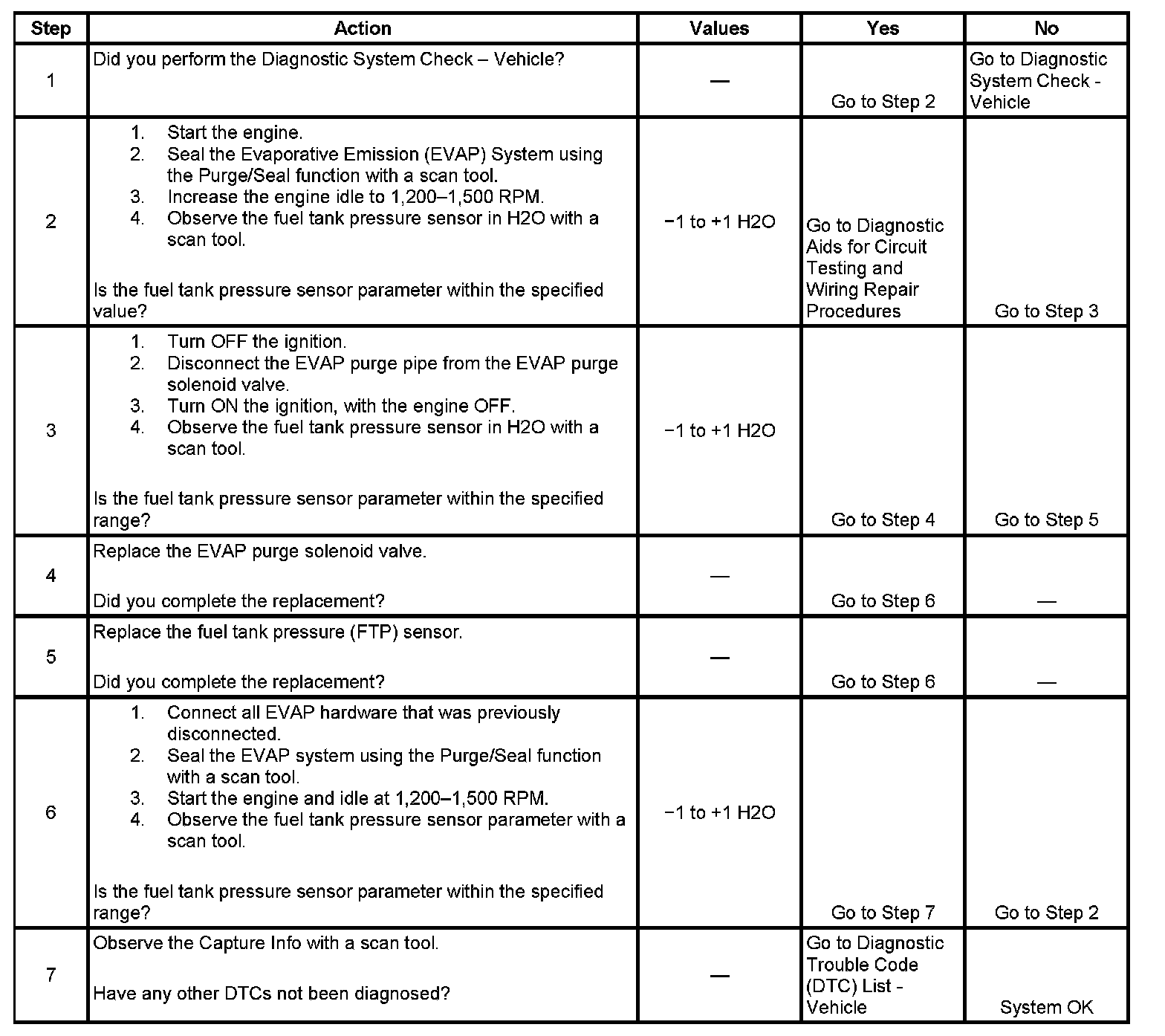 This DTC tests for undesired intake manifold vacuum flow to the Evaporative Emission (EVAP) System. The control module seals the EVAP system by commanding the EVAP canister purge solenoid valve Closed and the EVAP canister vent solenoid valve Closed. The control module monitors the fuel tank pressure (FTP) sensor to determine if a vacuum is being drawn on the EVAP system. If vacuum in the EVAP system is more than a predetermined value within a predetermined time, this DTC sets.