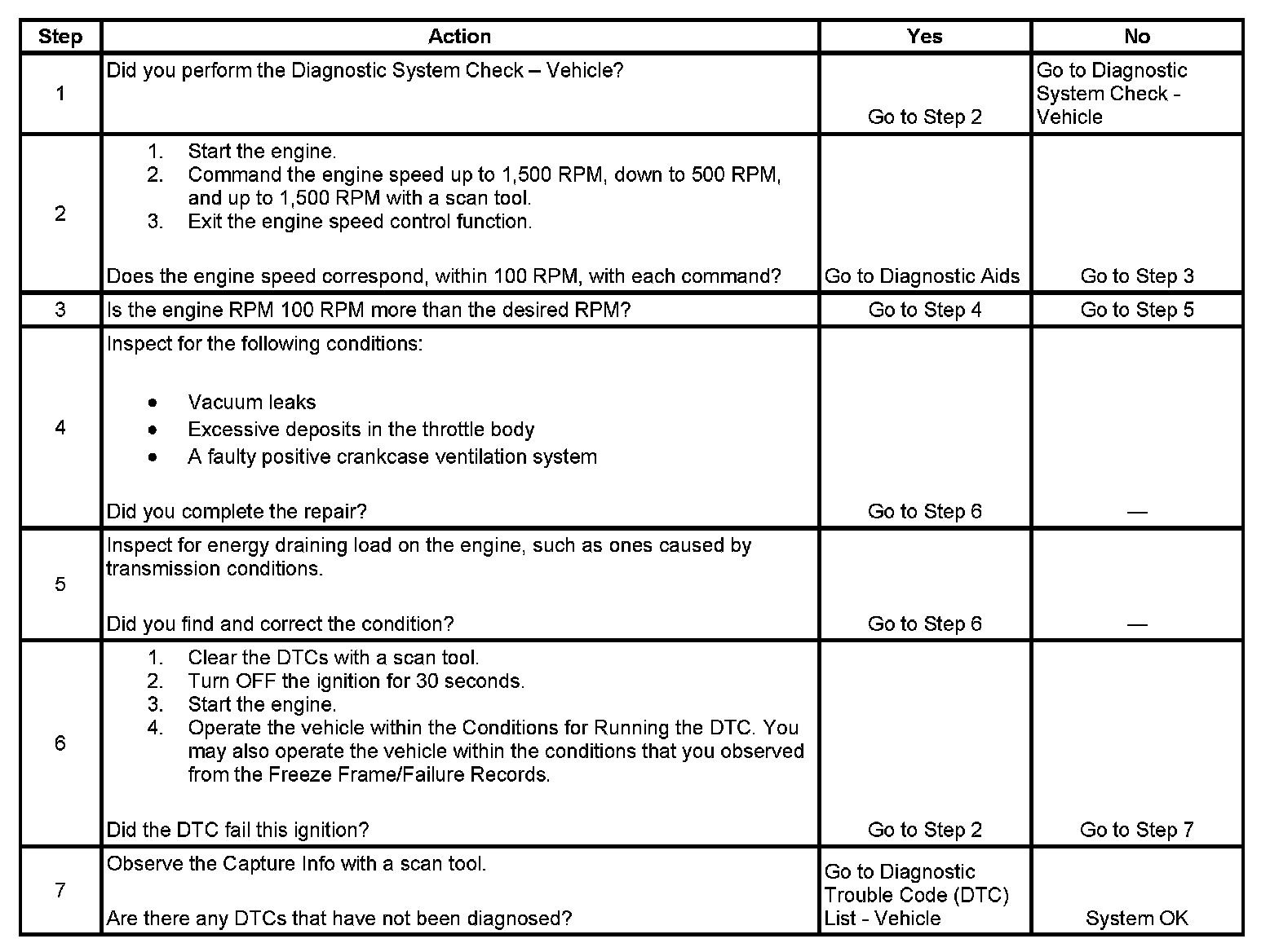 The throttle actuator control (TAC) system uses vehicle electronics and components to calculate and control the position of the throttle plate. In order to decrease idle speed the TAC system closes the throttle plate reducing airflow into the engine. In order to increase idle speed the TAC system opens the throttle plate allowing more airflow into the engine. If the actual idle RPM does not match the desired idle RPM within a calibrated time, this DTC sets.