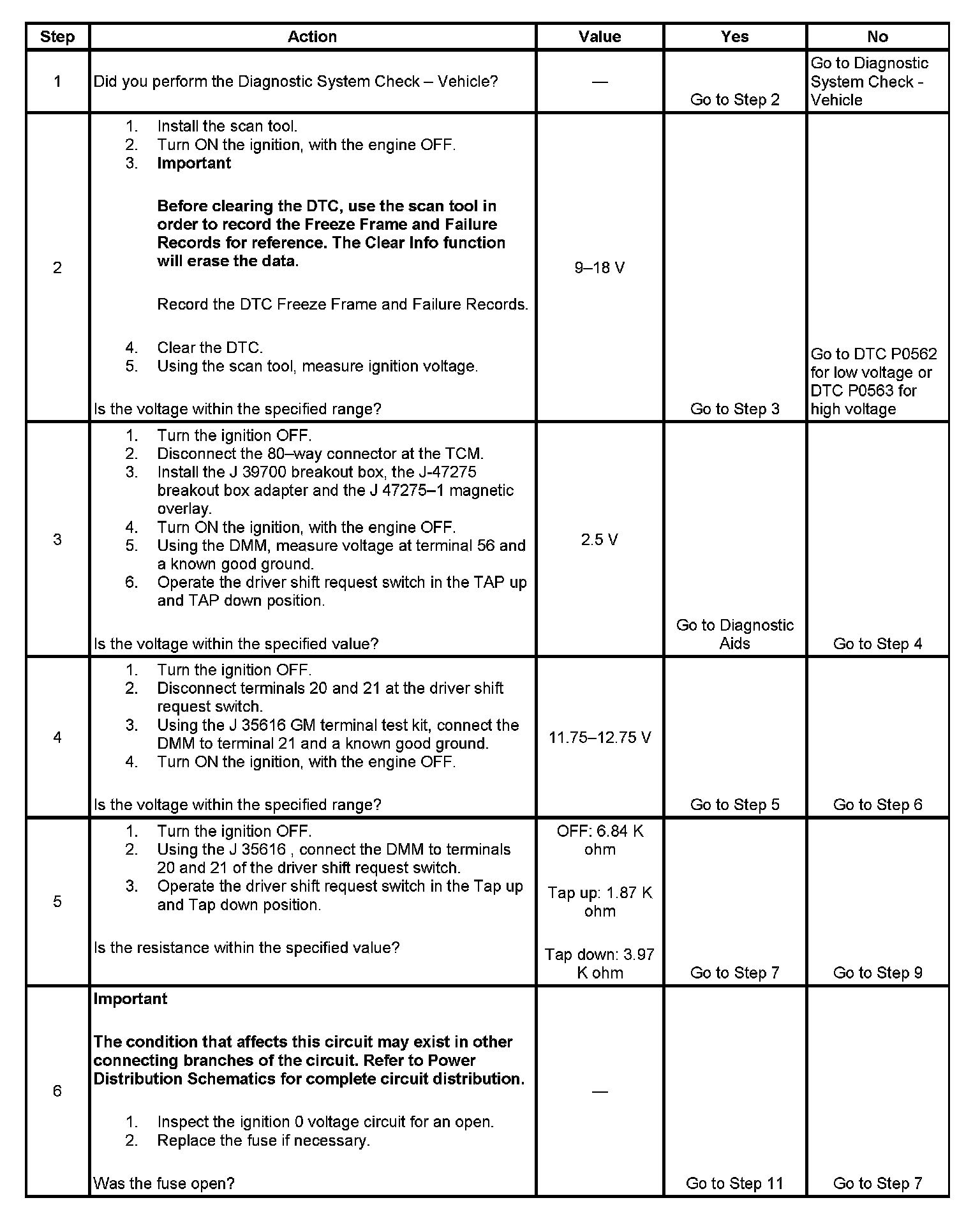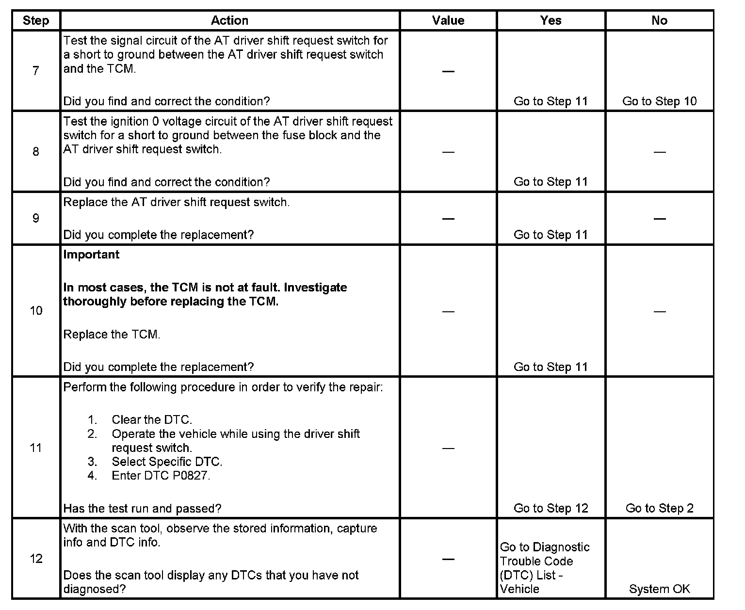 DTC P0827 sets when the transmission control module (TCM) detects a short to ground condition in the TAP up/down shift switch circuit for greater than 6 seconds when driver shift request is commanded.