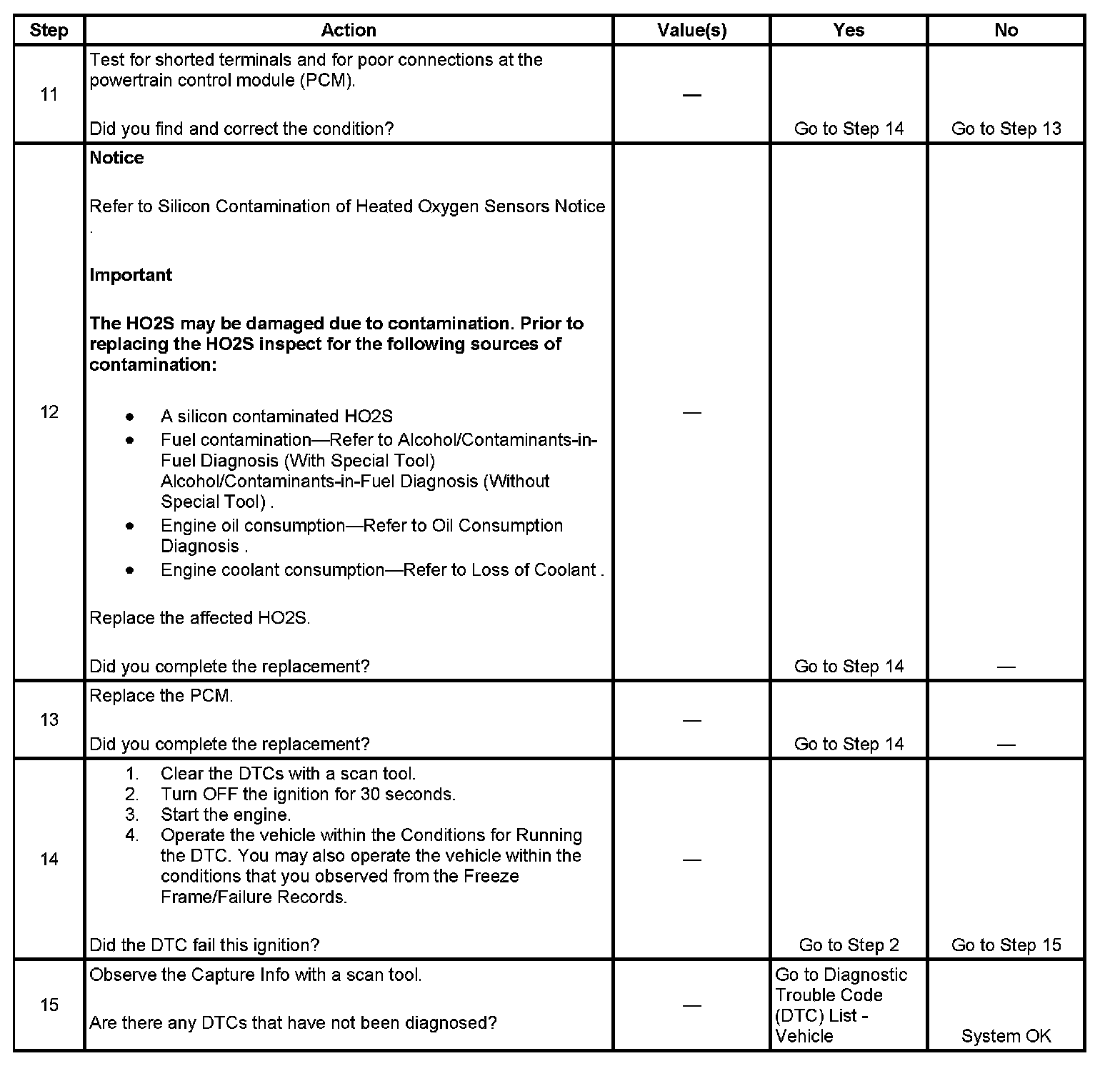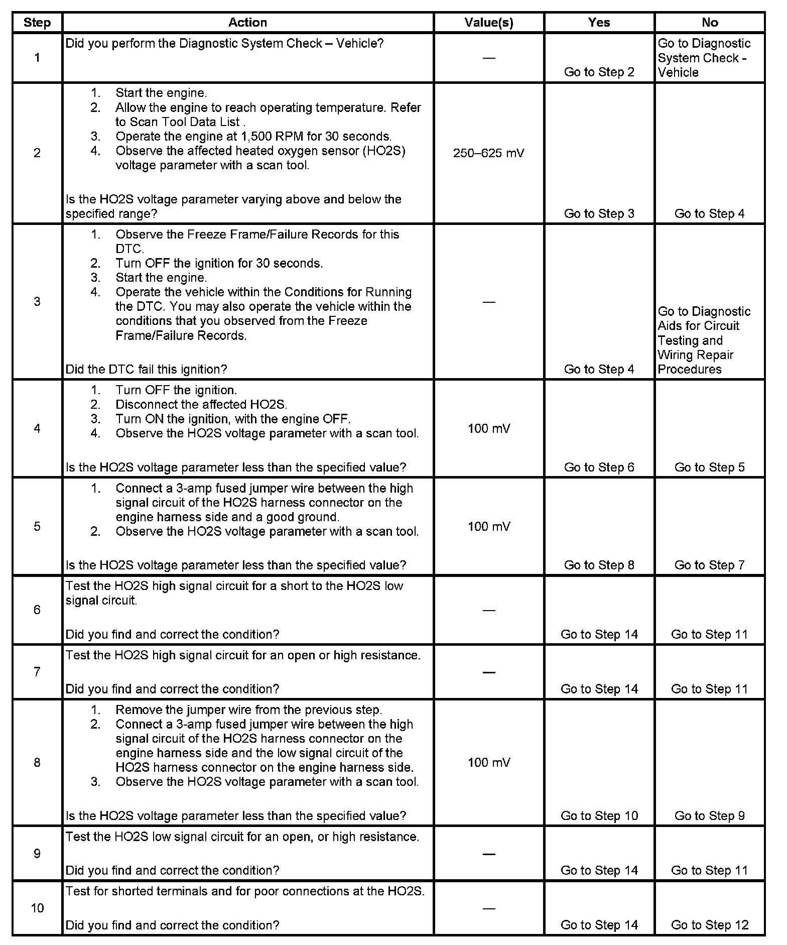 Heated oxygen sensors (HO2S) are used for fuel control and post catalyst monitoring. Each HO2S compares the oxygen content of the surrounding air with the oxygen content in the exhaust stream. The HO2S must reach operating temperature to provide an accurate voltage signal. Heating elements inside the HO2S minimize the time required for the sensors to reach operating temperature. The powertrain control module (PCM) supplies the HO2S with a reference, or bias, voltage of about 450 mV. When the engine is first started the PCM operates in open loop, ignoring the HO2S voltage signal. Once the HO2S reaches operating temperature and closed loop is achieved, the HO2S generates a voltage within a range of 0-1,000 mV that fluctuates above and below bias voltage. High HO2S voltage indicates a rich exhaust stream; low HO2S voltage indicates a lean exhaust stream. This diagnostic will only run once per ignition cycle. The PCM monitors the number of rich-to-lean and lean-to-rich transitions. If the PCM detects that the number of transitions were less than a specified value, DTC P1133 sets for HO2S bank 1 sensor 1, or DTC P1153 sets for HO2S bank 2 sensor 1.