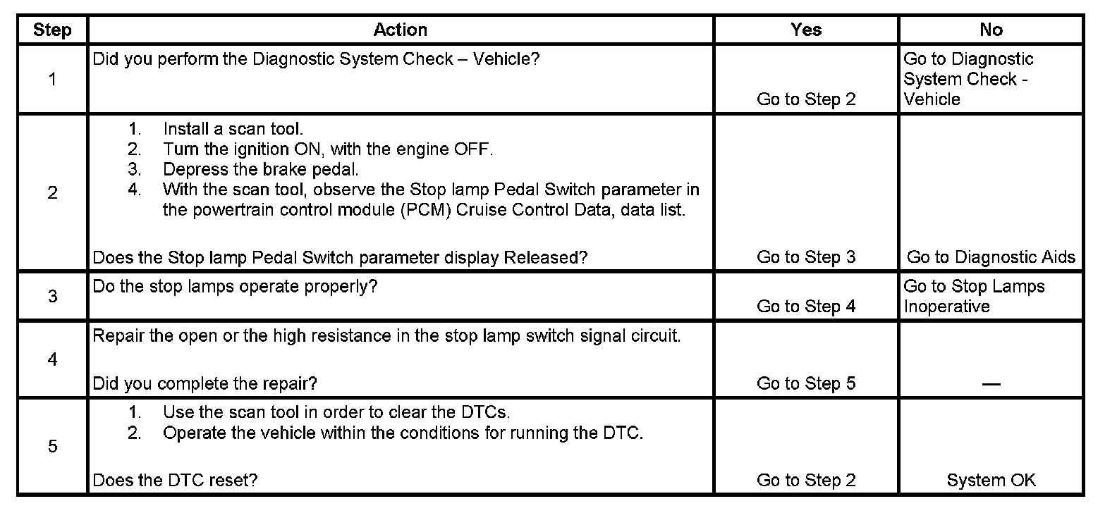 This diagnostic test functions on the assumption that a sudden decrease in vehicle speed is caused by a brake pedal application. When the powertrain control module (PCM) detects that there is a 4.2 km/h(2.6 mph) or greater decrease in vehicle speed within 0.25 second and a transition of the torque converter clutch (TCC) brake switch without a transition of the stop lamp switch, the PCM sets DTC P1574.