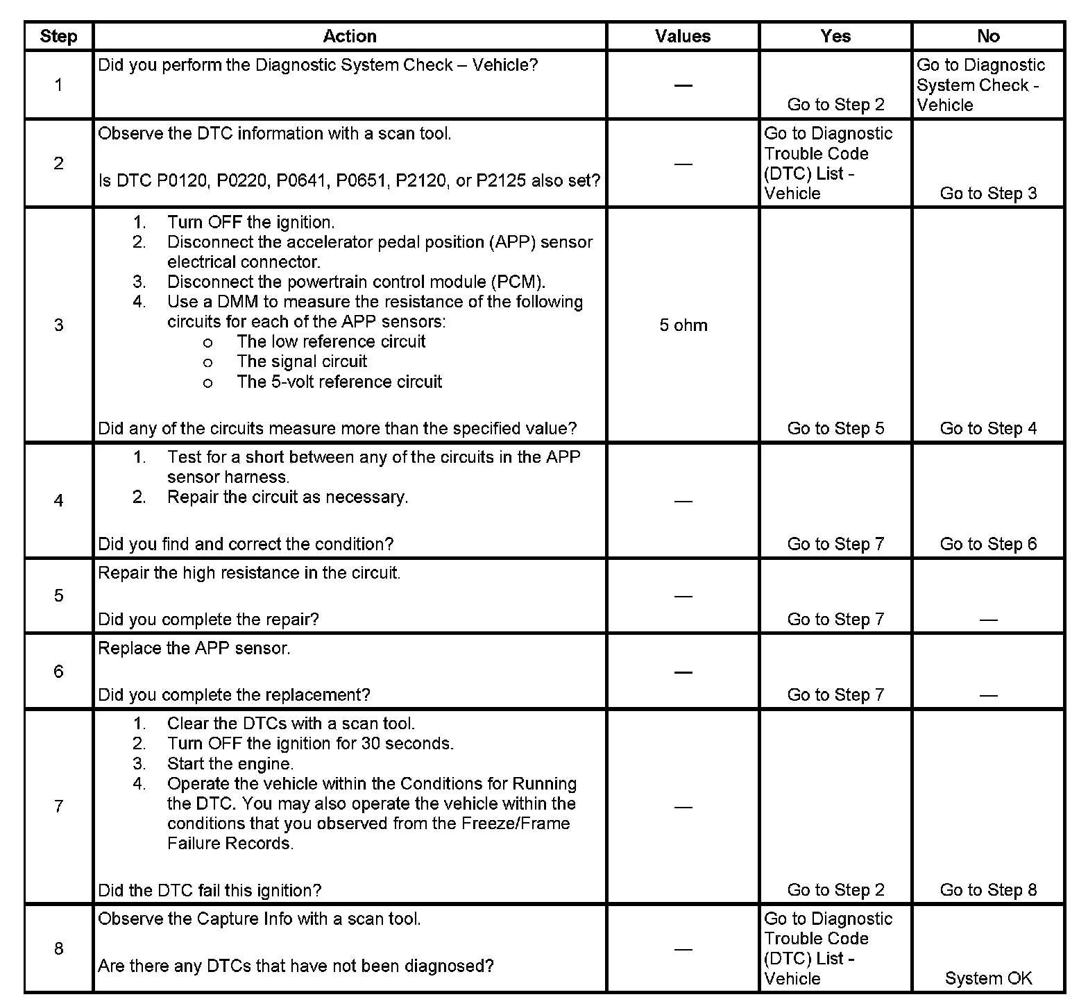 2. Any circuit faults on either APP sensor 1 or 2 will set one of the DTCs listed. Refer to the appropriate table for diagnosis.
