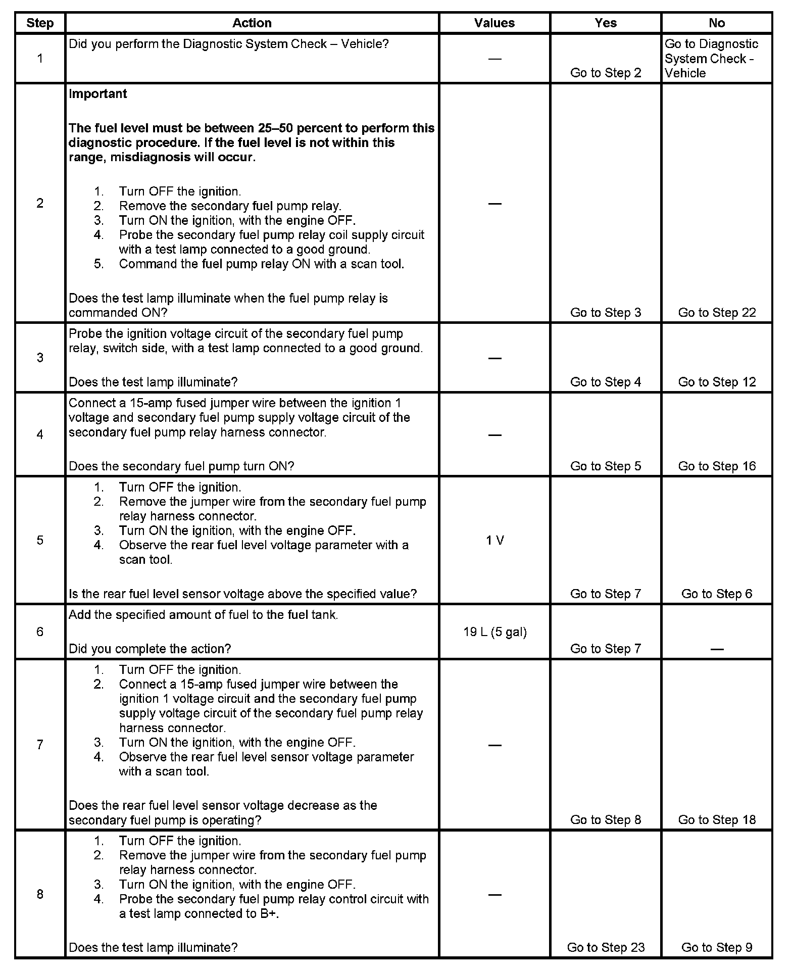 7. This step tests the secondary fuel pumps ability to transfer fuel. The rear fuel level sensor voltage should decrease while the secondary fuel pump is ON.