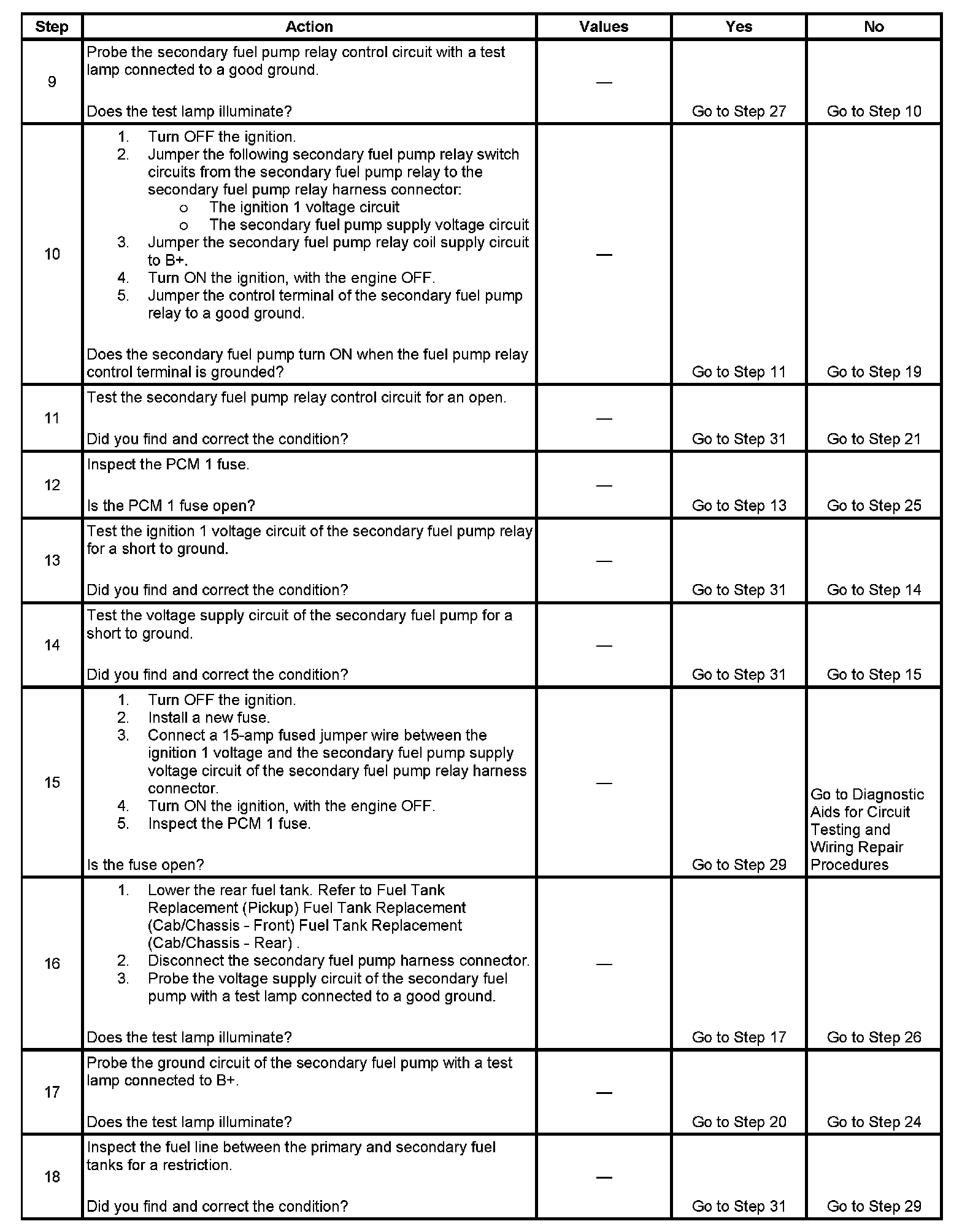 9. This step tests for a short to voltage on the control circuit of the secondary fuel pump relay. If the test lamp illuminates, a short to voltage is indicated.