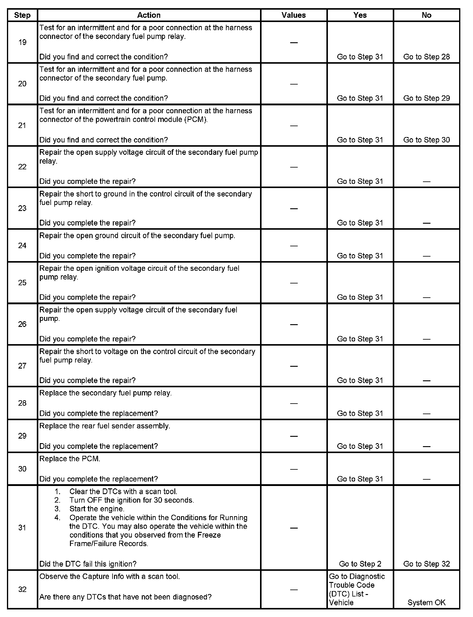 The secondary fuel pump is located in the rear fuel tank. The secondary fuel pump is powered by a secondary fuel pump relay. Fuel is transferred from the rear fuel tank to the front fuel tank in order to ensure all of the usable fuel volume is available to the primary fuel pump. The secondary fuel pump relay supply voltage is received from the primary fuel pump relay when the primary fuel pump is energized. This DTC sets when the powertrain control module (PCM) commands the secondary fuel pump ON and a predetermined change in both the front and rear fuel level sensors does not occur.