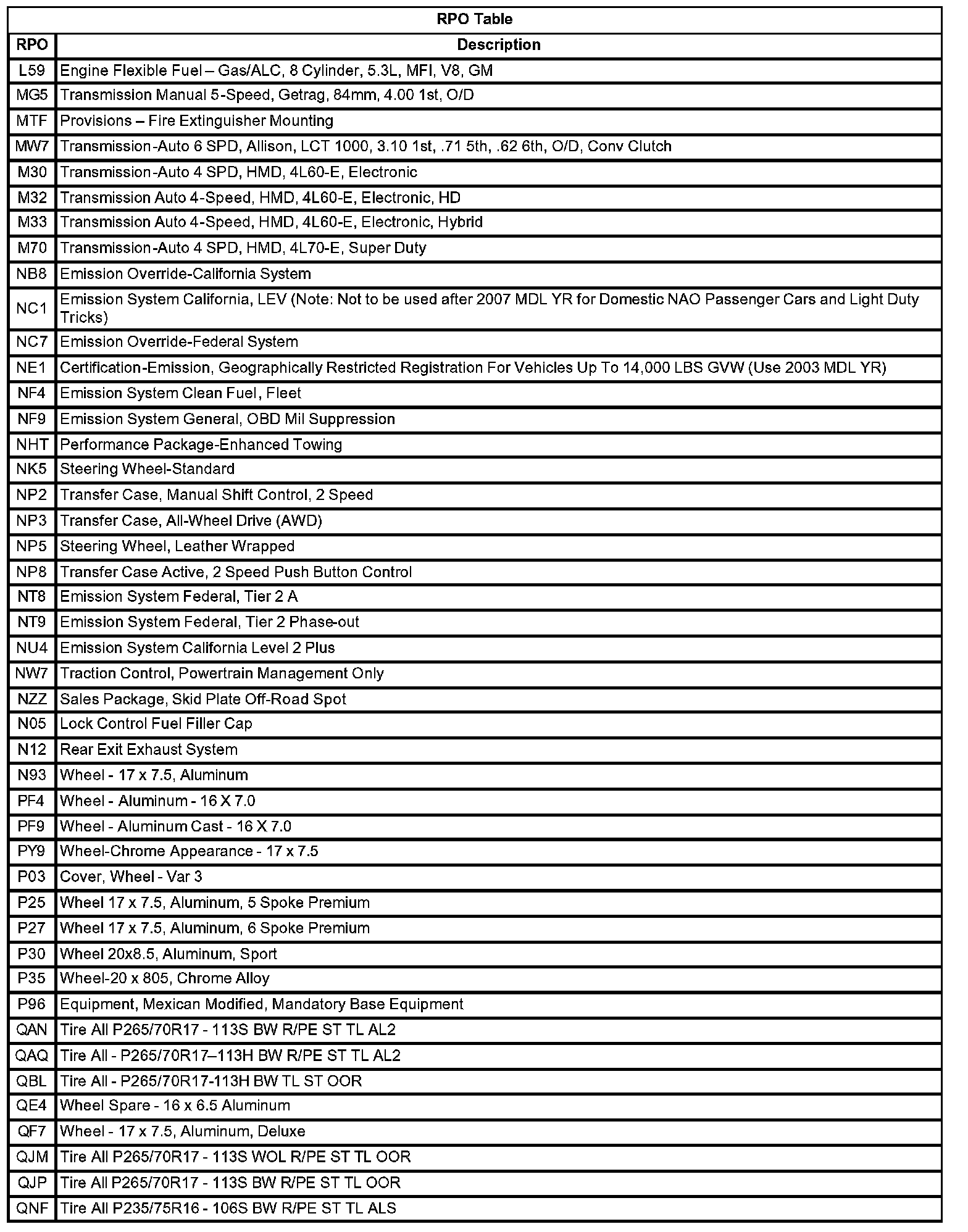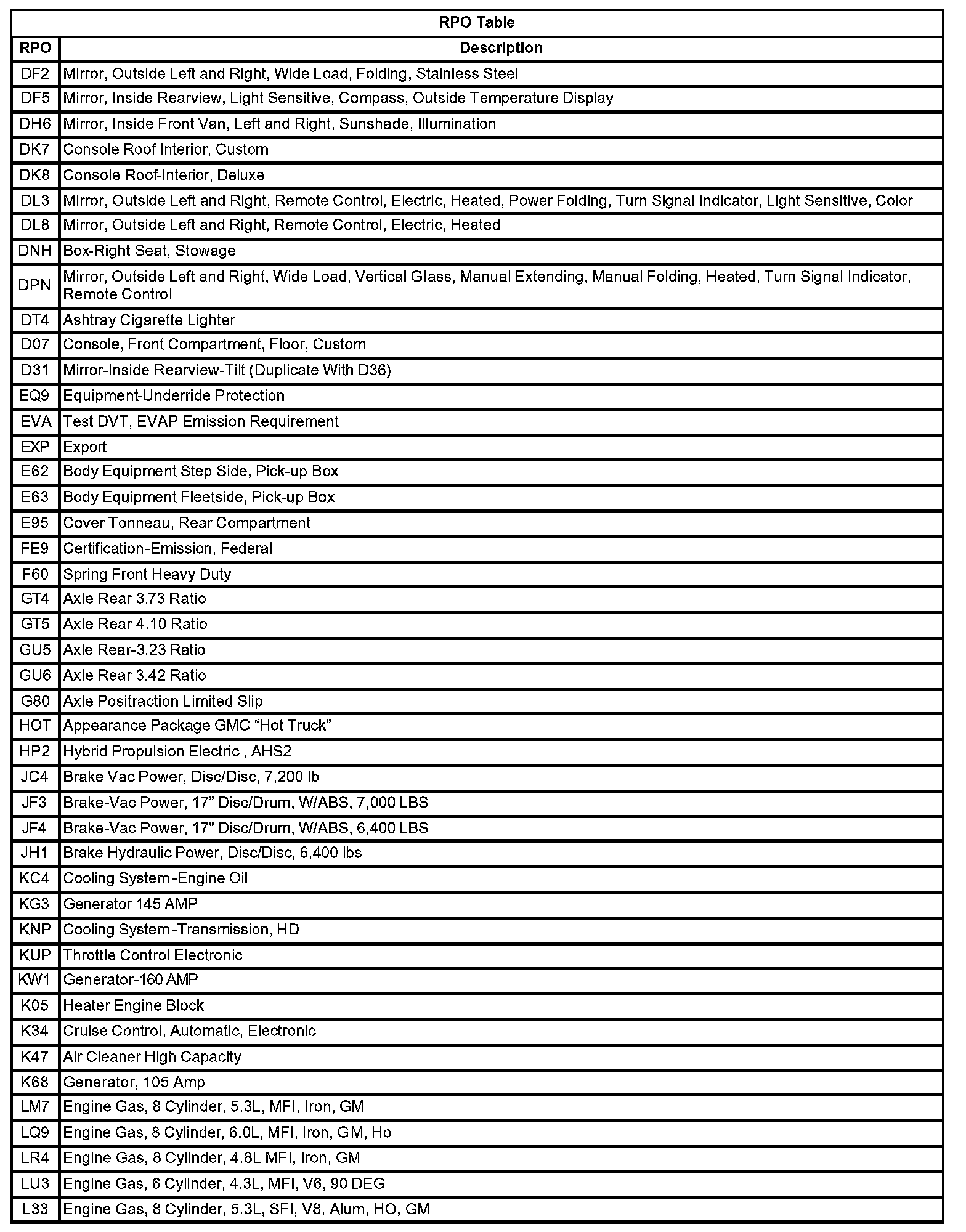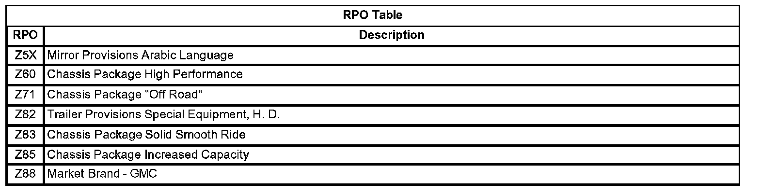 RPO Code List (Standard Duty)